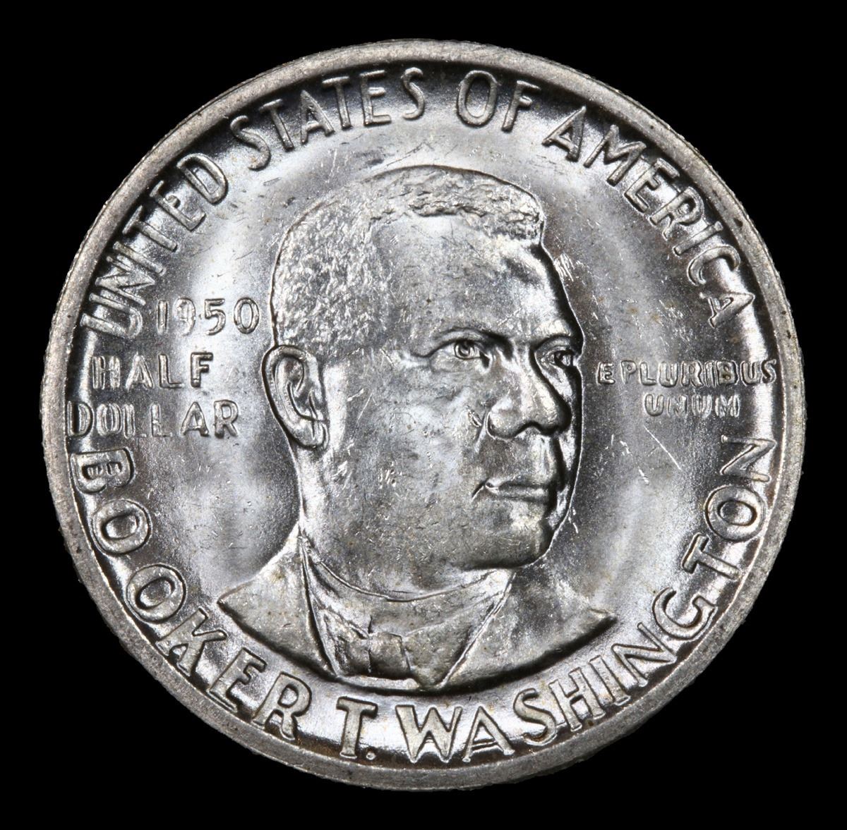 1950-s BTW Old Commem Half Dollar 50c Grades Choice+ Unc. When examining a Booker T. Washington commemorative look for wear on the high points, on the obverse that is Mr. Washington's right Cheek (from his perspective), and on the reverse the arches on the top building.