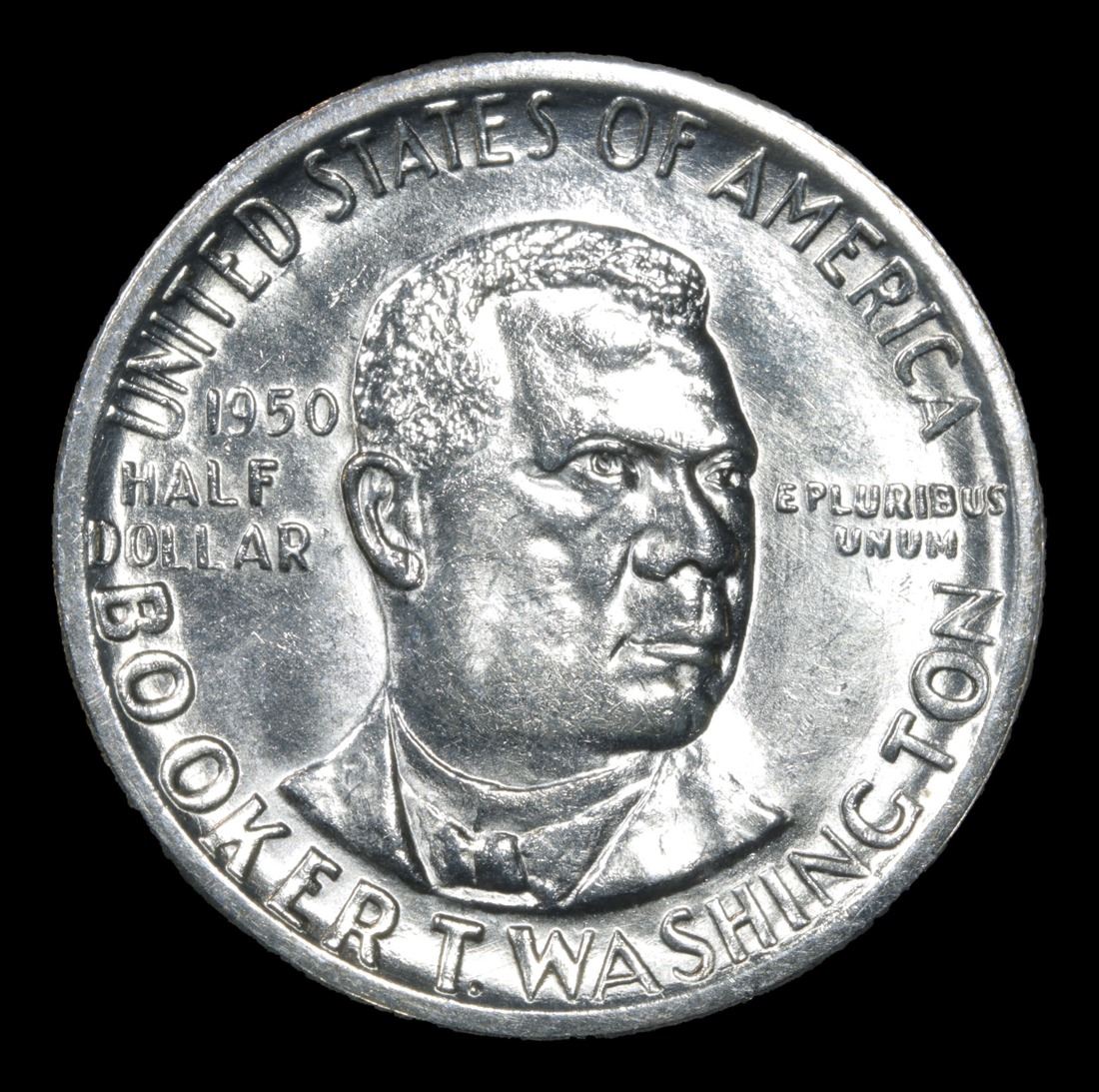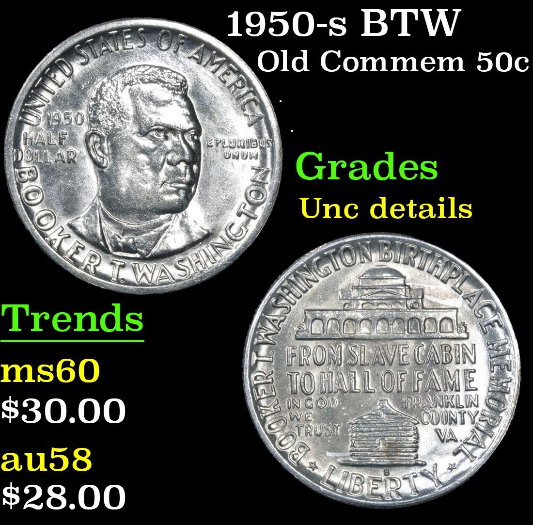 1950-s BTW Old Commem Half Dollar 50c Grades Unc Details. When examining a Booker T. Washington commemorative look for wear on the high points, on the obverse that is Mr. Washington's right Cheek (from his perspective), and on the reverse the arches on the top building.