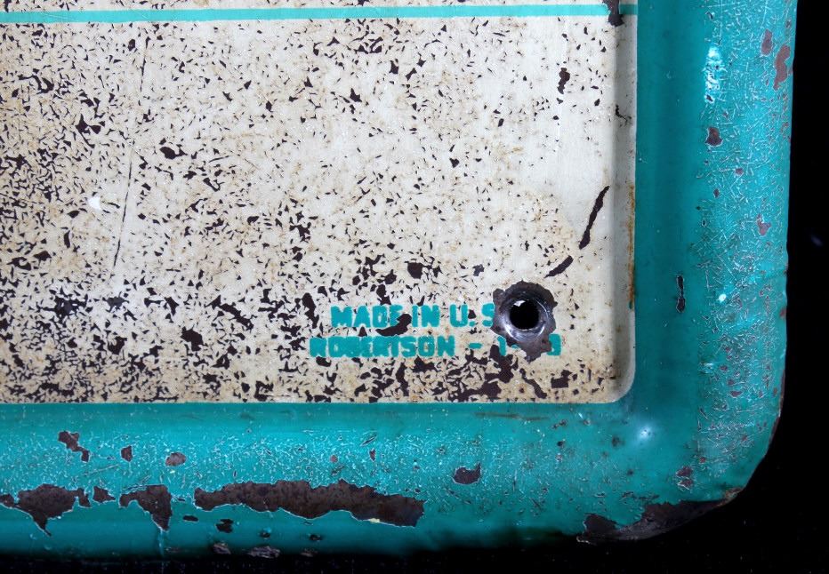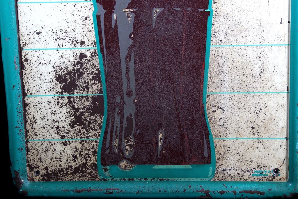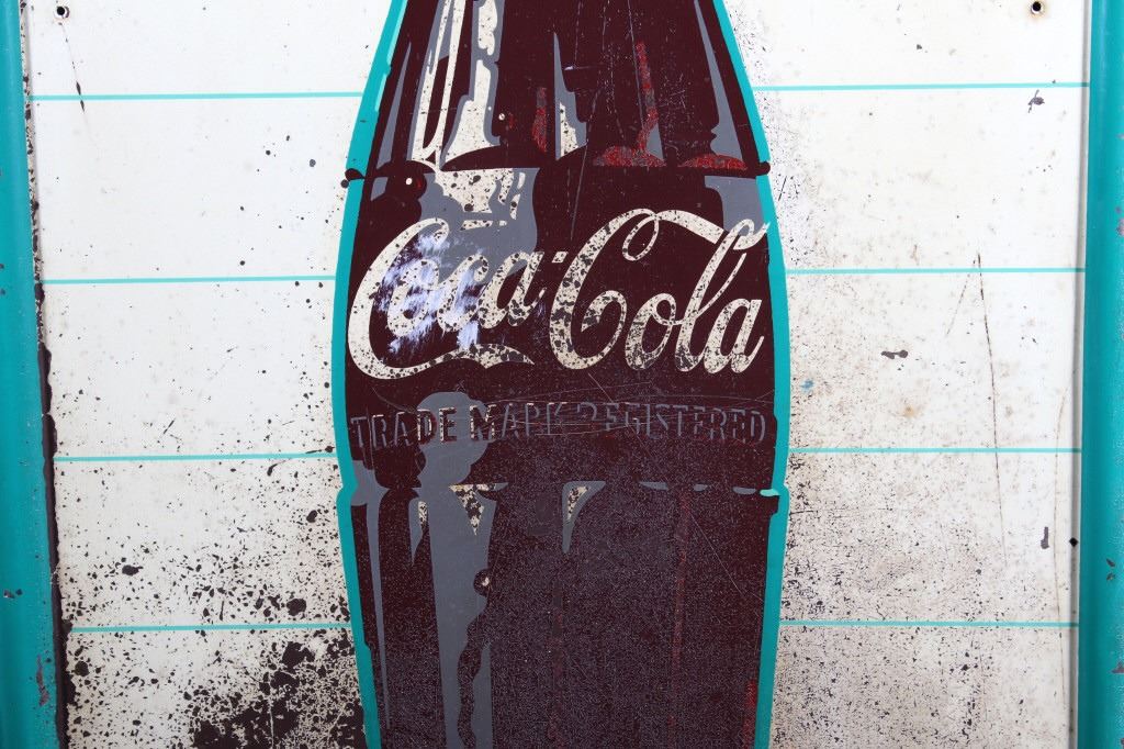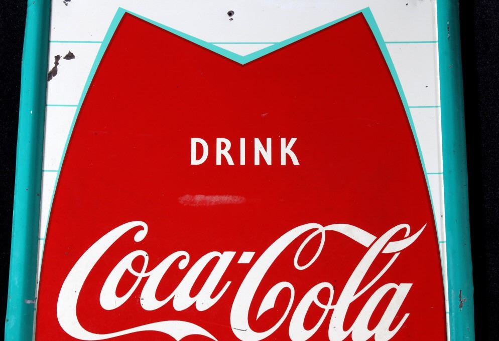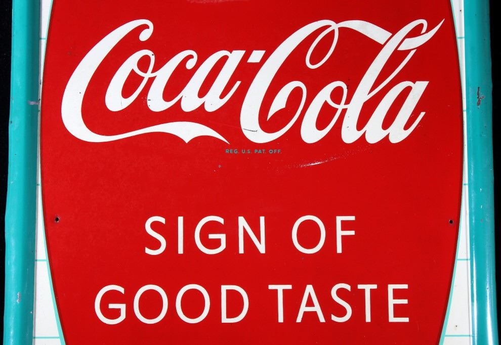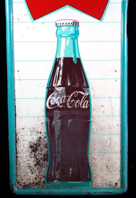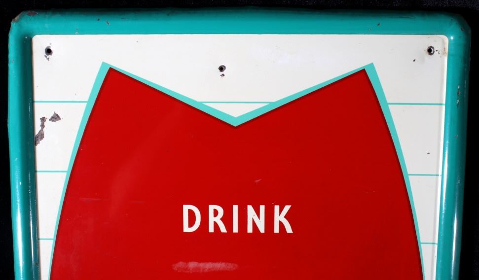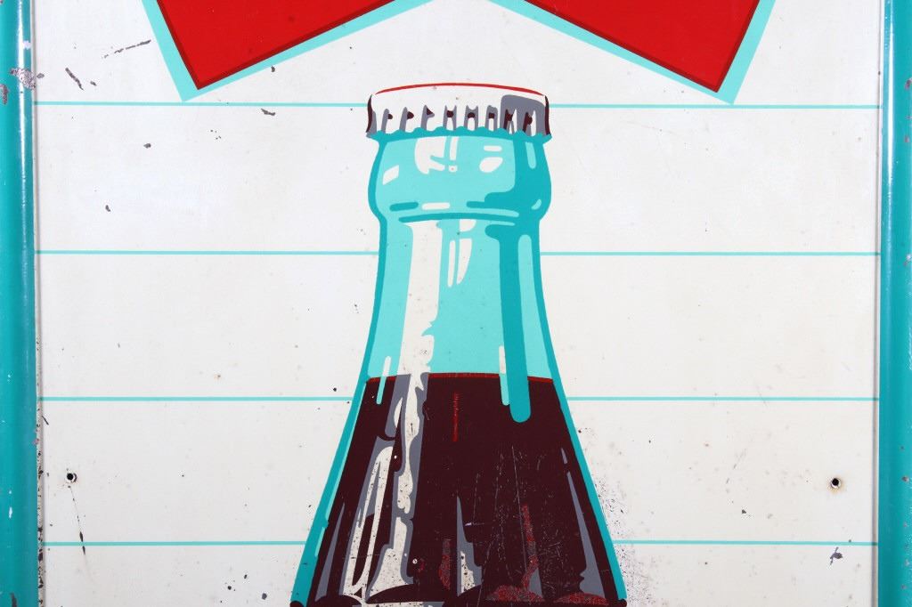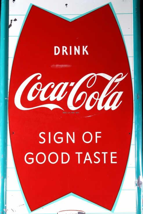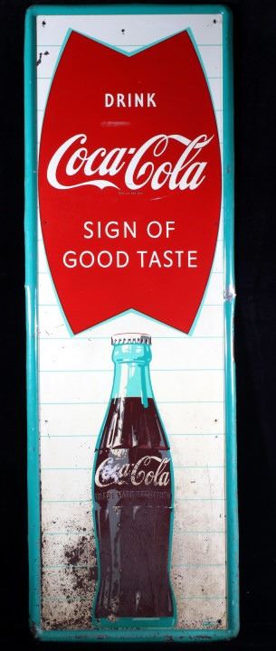 Available in this lot we have a original vertical fishtail Coca-Cola advertising sign originating from the 1950's. The sign shows a off white background with a teal border and horizontal lines. The top half of the piece shows a vertical red double fishtail piece with a teal border and white lettering. The red section is marked "Drink Coca-Cola Sign of Good Taste" in white lettering and "Reg. U.S. Pat. Off." in teal letters below the Coca-Cola. The bottom half of the sign shows a teal bottle of Coke with "Coca-Cola Trade Mark Registered" across the bottle. The bottom right hand corner of the sign is marked "Made In U.S. Robertson- 1" with the rest blocked out by a wall mounting hole. Overall, the sign shows good condition for its age with visible wear and damage to the paint. The sign measures 53 1/2" tall by 17 1/2" wide.
