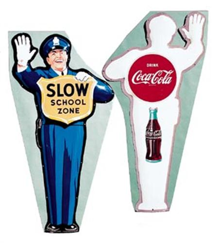 Standing 5' tall dated April 1950. This is a very nice overall example. The piece is not pictured but it is being sold with a base and a half pole on which it could be mounted. There are just a few nuts and bolts that are currently holding the policeman together. On the front side it is very clean overall with only a few minor surface scuffs and scratches, some very light edge rust at just a few points. A few minor marks, hairline scratches, and tiny paint chips or nicks at the extreme outer edge in a few spots. Cond of the front is 8.4-8.7. cond of the back is wonderfully crisp as well as 8.3-8.6. It has a few minor surface scrapes, scratches and rubs. Nothing at all advanced or extremely noteworthy. Just a little minor wear overall and light soiling. 1-2 shallow scratches of a hairline variety.