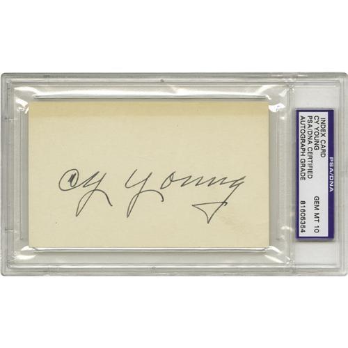 <B>1950's Cy Young Signed Index Card, Gem Mint 10.</B></I> An exceptionally bold black ink signature from the man who will hold the career wins record for eternity. Denton True Young was an old man when he signed this blank 3x5" index card for a young fan, but the resulting autograph is strong and steady and perfect for display. Minor toning along the upper edge is of no concern. Encapsulated by PSA/DNA for protection and unquestioned authenticity.