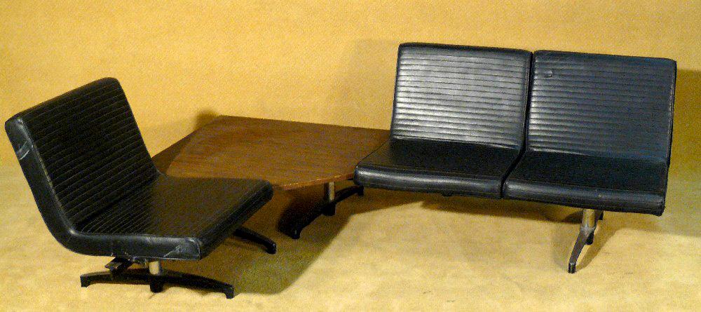 1950's High Style Knoll Style black chairs in an L shaped pattern with desk in the middle
