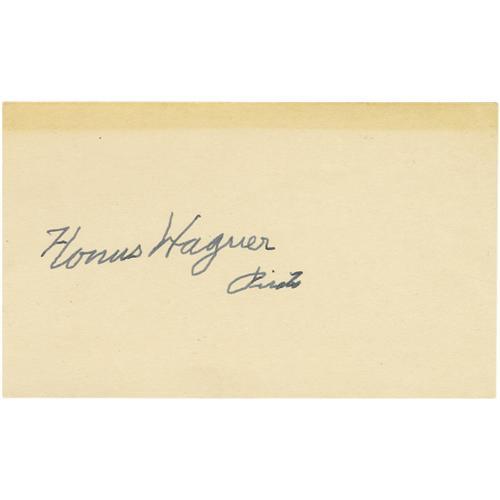 <B>1950's Honus Wagner Signed Index Card.</B></I> Still faithful to the uniform he first wore as a twenty-six year old shortstop in the year 1900, an elderly Flying Dutchman adds the word "Pirates" to his 9+/10 black ink signature. The medium is a blank 3x5" index card, Mint but for the light strip of innocuous toning along the upper edge. <I>LOA from PSA/DNA.</B></I>