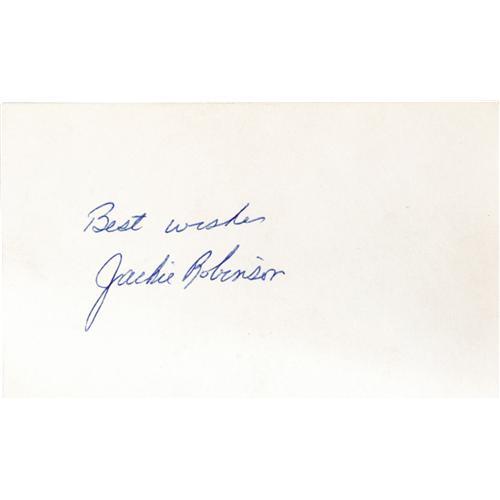 <B>1950's Jackie Robinson Signed Index Card.</B></I> Start searching for a great photo of this civil rights pioneer, because we have the perfect autograph to mat and frame with it. This simple blue ink inscription, "Best wishes, Jackie Robinson," is literally unimprovable, a guaranteed 10/10. The blank 3x5" index card is likewise pristine, with a small handwritten identification on the verso from the original collector. Arguably the most important autograph, all things considered, in the hobby. <I>LOA from PSA/DNA.</B></I>