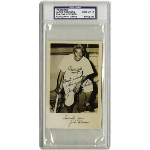 <B>1950's Jackie Robinson Signed Postcard, PSA Gem Mint 10.</B></I> Frankly, we would have been shocked with any other grade for this blue fountain pen inscription than the Gem Mint rating that PSA/DNA awarded. And matching the brilliance of the inscription and autograph is the magnificent image of a smiling Jackie on the steps of the Ebbets Field dugout. The souvenir postcard presents just the lightest touch on one corner to keep it humble, as it would otherwise be flawless in every regard. Encapsulated by PSA/DNA for protection and unquestioned authenticity.
