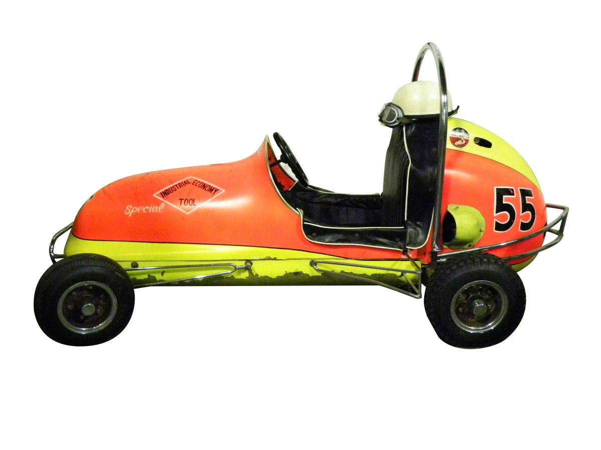 1950's Kid's Quarter Scale Midget Racer, as raced. Continental Motor Corp., engine. Original paint, decals, upholstery and engine. Comes with original kids 1/2 helmet and goggles. 80 X 36 X 38 inches.