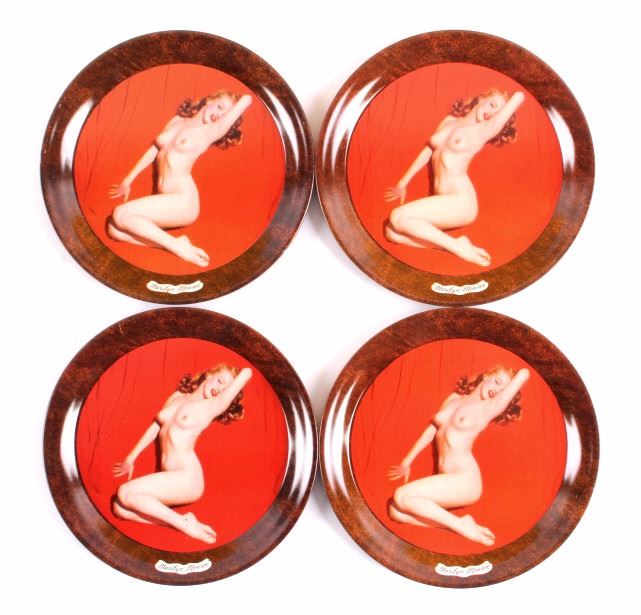 This is a collection of four original Marilyn Monroe nude tip trays from the 1950's. The trays are tin litho and are marked "Marilyn Monroe". Each tray is in good condition. They measure 4" in diameter.