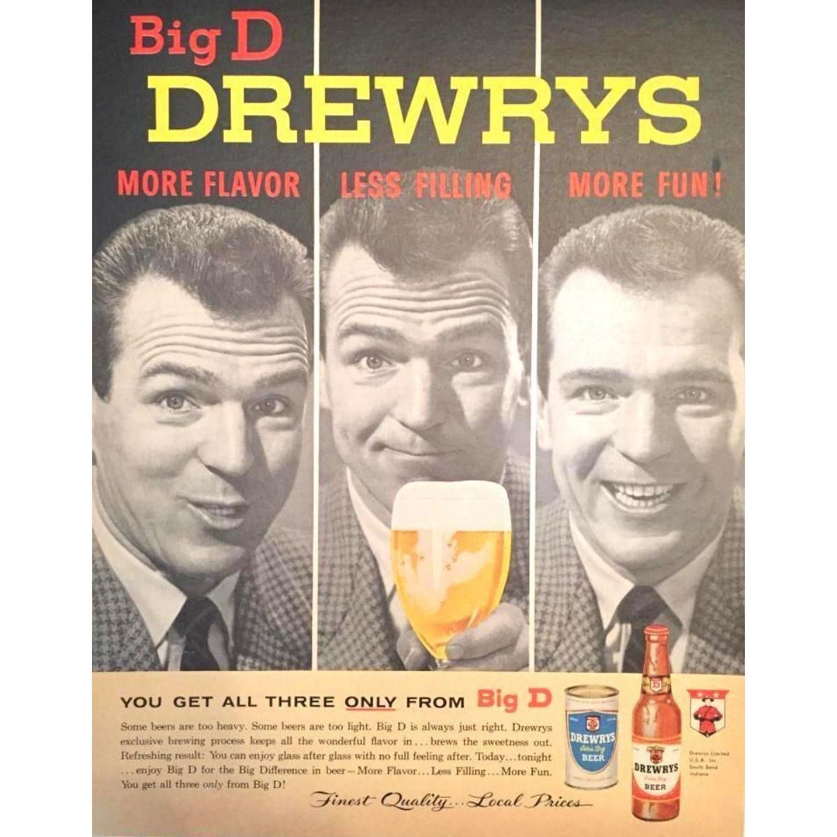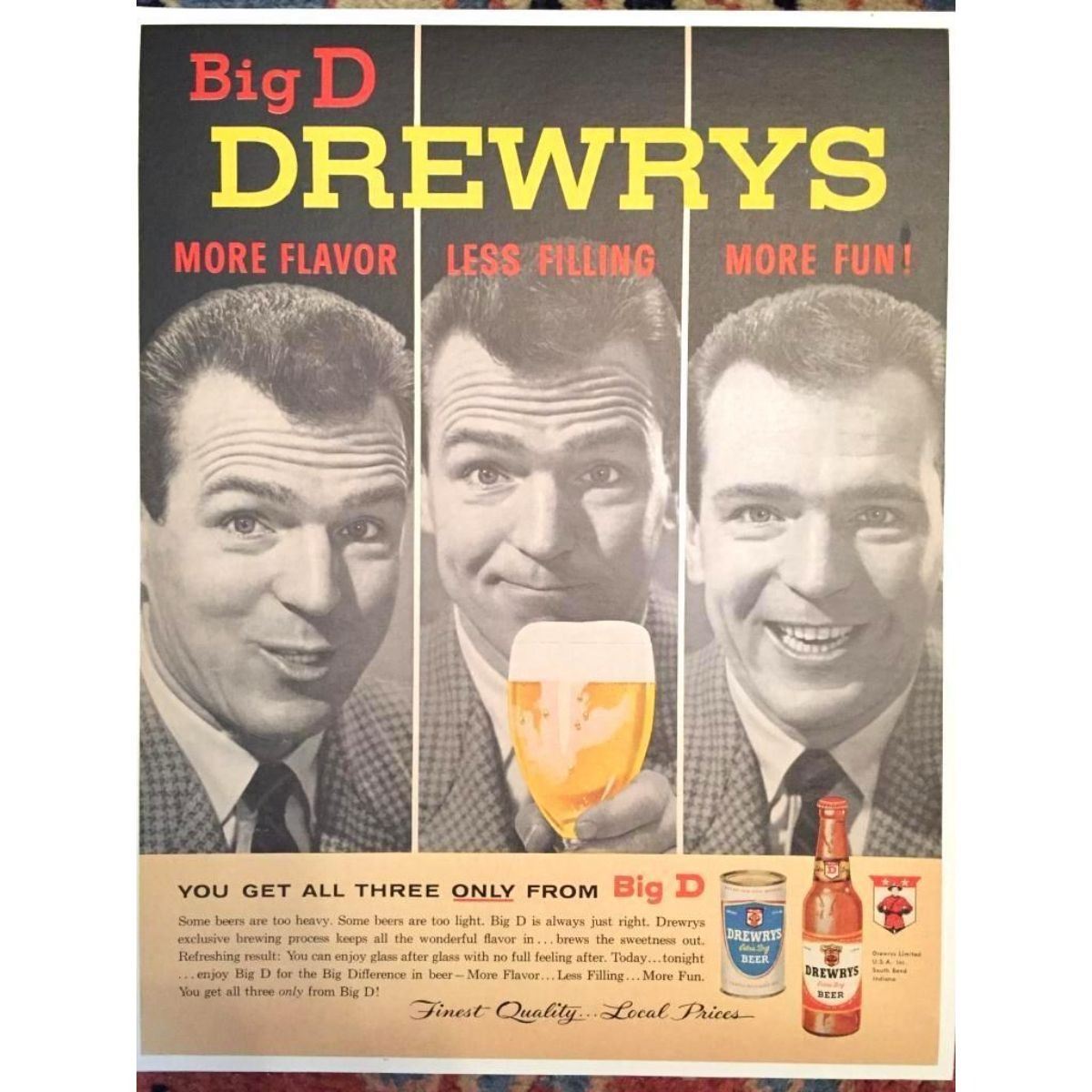 Original 1950's magazine advertisement for the Indiana brewery, Drewrys, Big D. slogan reads, " More Flavor, Less Filling, More Fun." 10 " X 13" mounted on archival linen for preservation.
