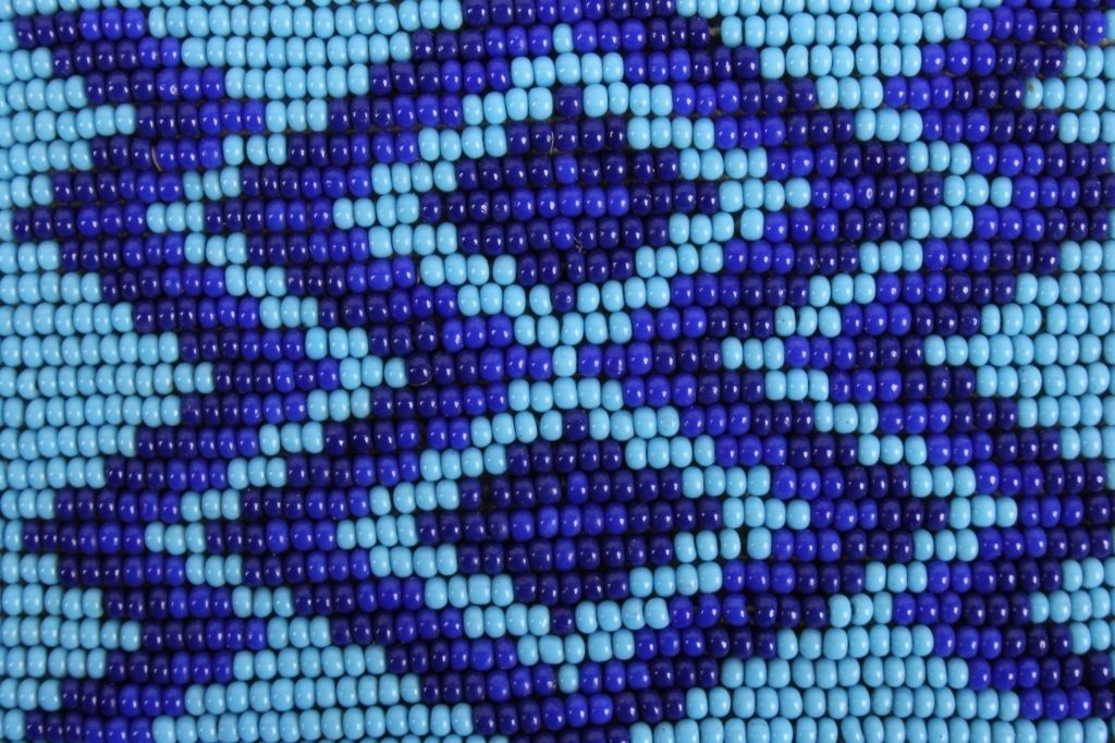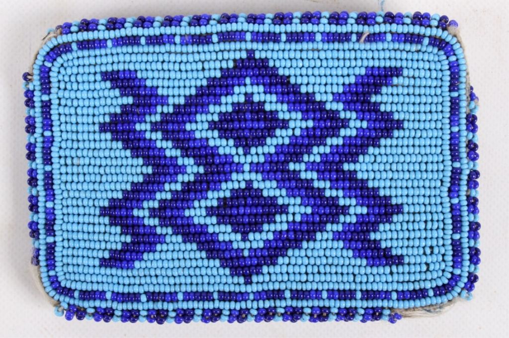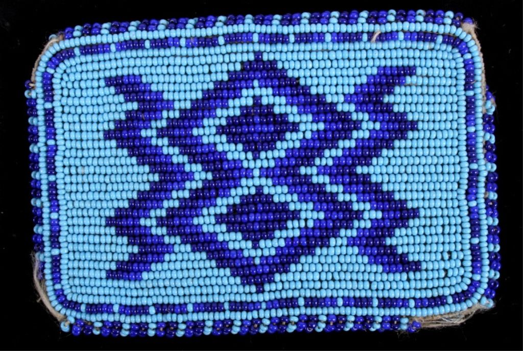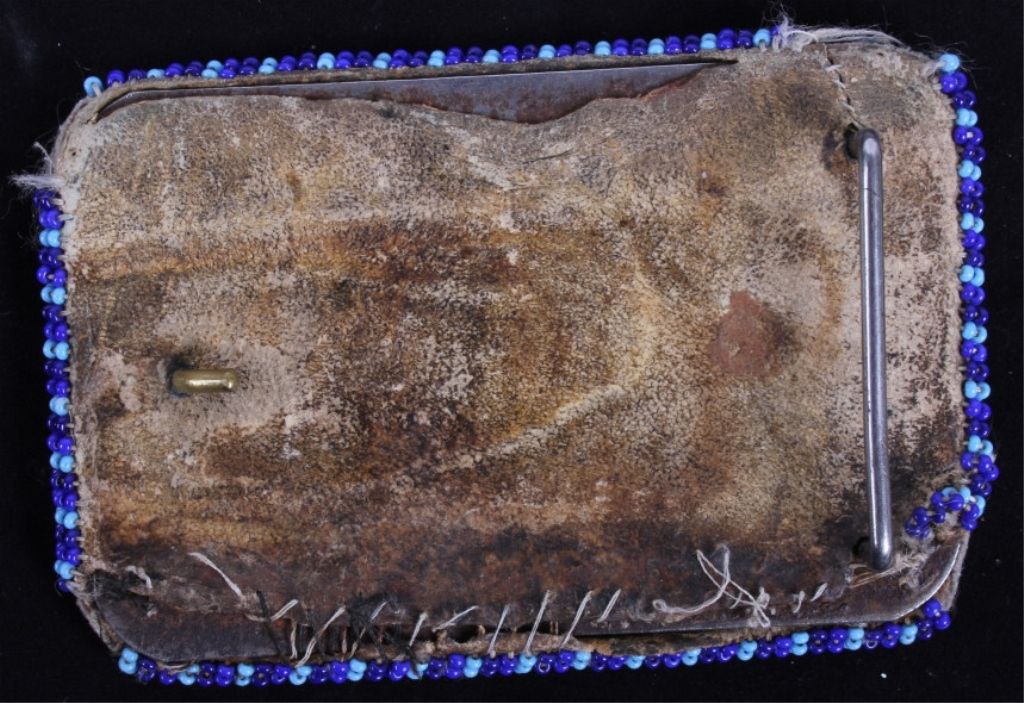 This is has a metal buckle surrounded by Indian tanned hide and tightly woven glass trade beads. The piece was hand made by a Northern Plains Native American in the 1950's. The back shows wear, but overall agood piece. Measures 2 7/8"x4 1/4"
