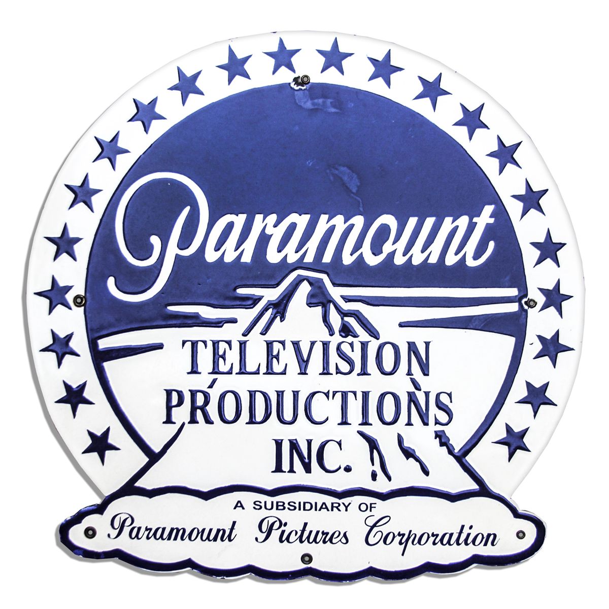 1950's Paramount sign, likely hung on their Los Angeles lot. Sign is for Paramount's short-lived television production company which lasted from the early 1950's to 1959, ending with a controversial takeover of the DuMont network that aired its programming. Royal blue and white metal sign reads ''Paramount Television Productions Inc. / A Subsidiary of / Paramount Pictures Corporation'' against the iconic Paramount logo. Single-sided sign has its original porcelain finish, and six small holes encircle the sign so that it can be hung. Measures 20'' x 19.75''. Light scratching and chipping to finish around holes; overall in very good to near fine condition.