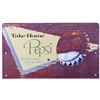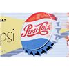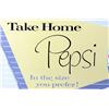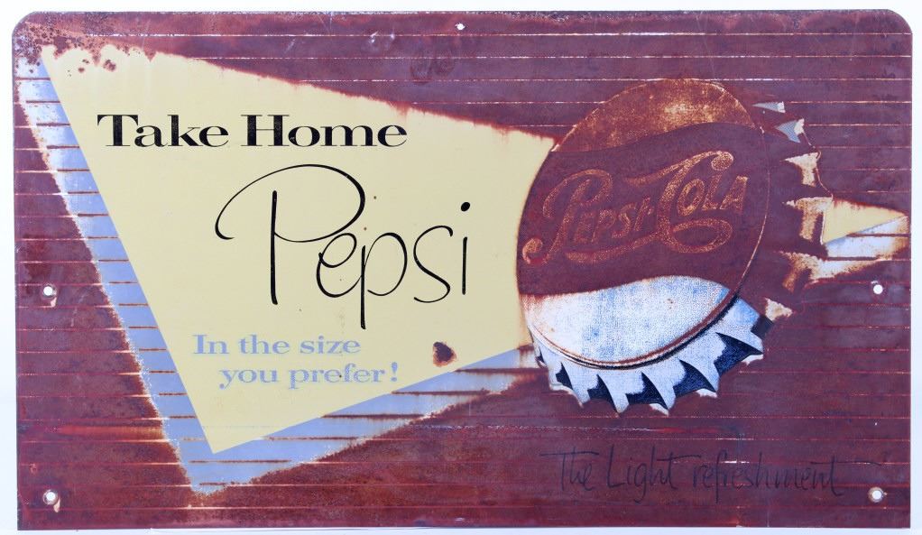 For your consideration is this 1950's Pepsi-Cola two sided metal sign. The sign is light gray with white pinstripes with a yellow large yellow pennant covering much of the sign and appearing to cast a shadow over part of the pinstriped field. Wording inside the pennant reads, "Take Home Pepsi In the size your prefer!" Superimposed over the small end of the pennant is the 1950's Pepsi- Cola bottle cap logo. Underneath the logo reads, "The Light refreshment", in cursive script. Sign manufacturing info at the very bottom of the sign reads, "Zell Atlanta/ Made in U.S.A.". The other side of the sign was the same. Though rusted on this side, the yellow and dark gray still show and all the lettering is still legible. The sign measures 26 3/4" 15 1/2".
