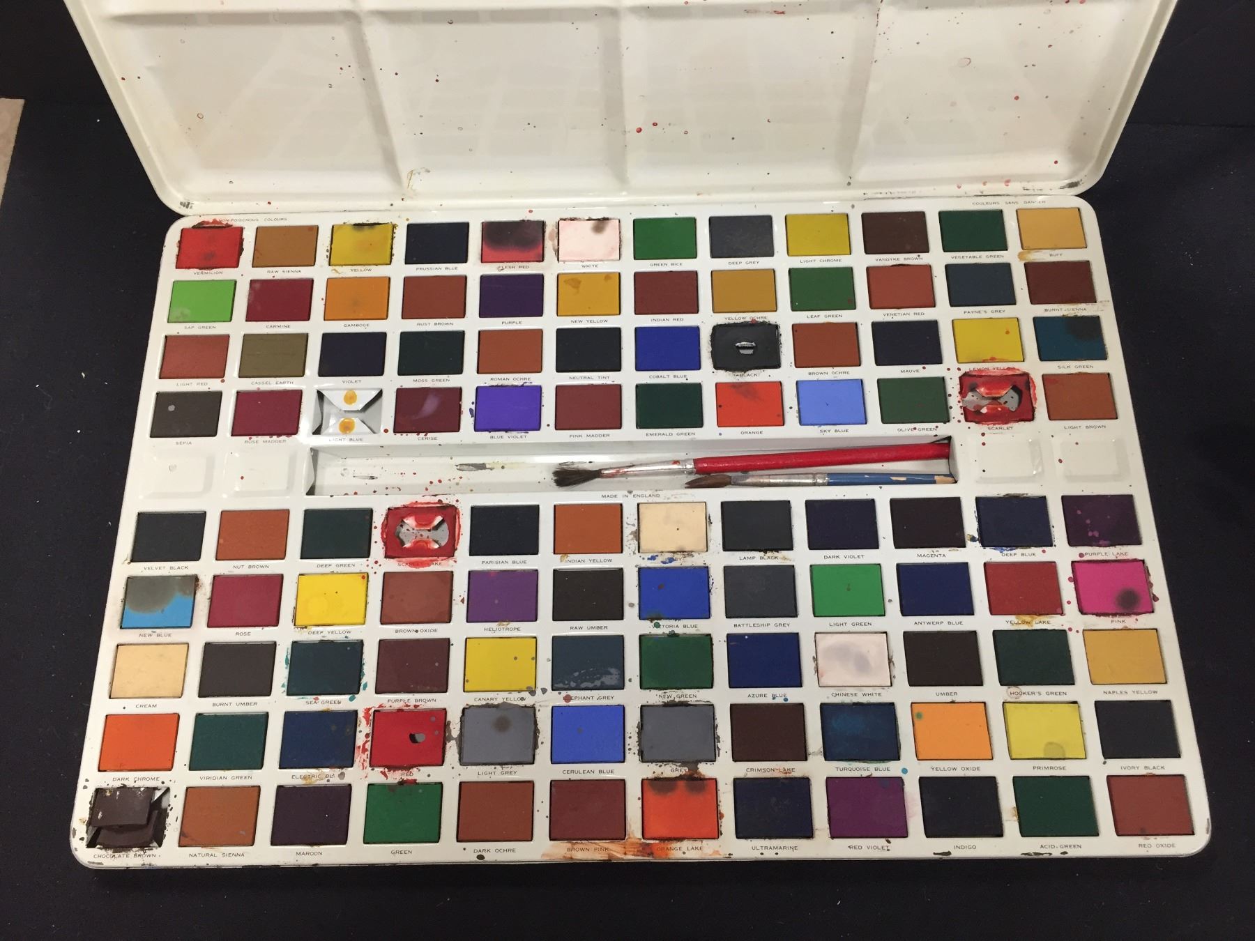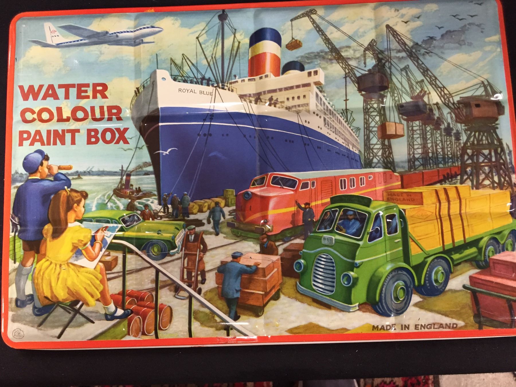 1950's Retro Vintage Tinplate Painting Set Box. Made in England. Nice Graphics. 14" w x 9.5" d In Very Good Shape.