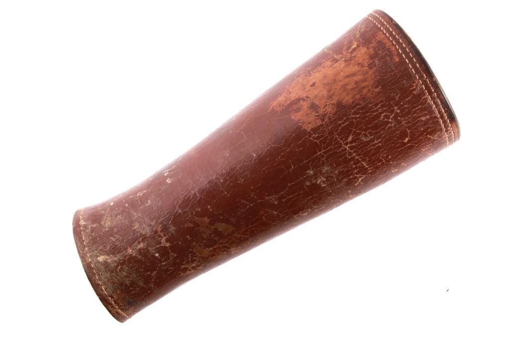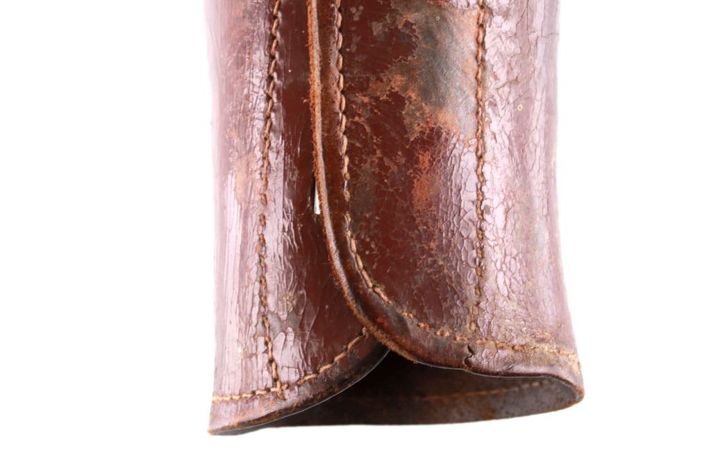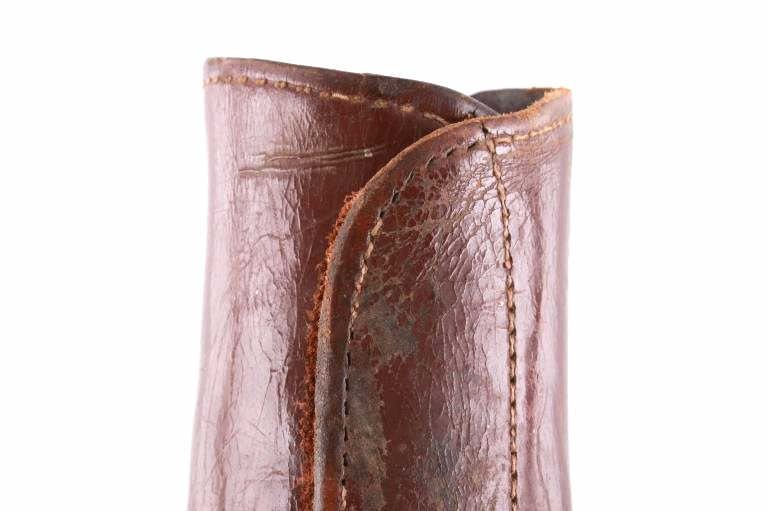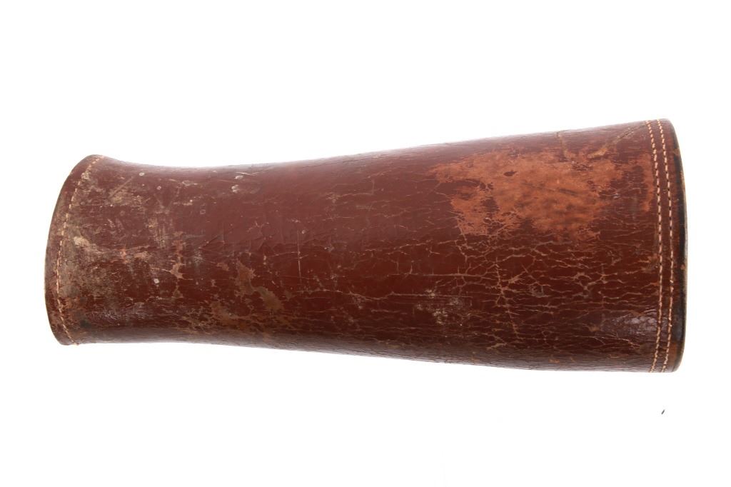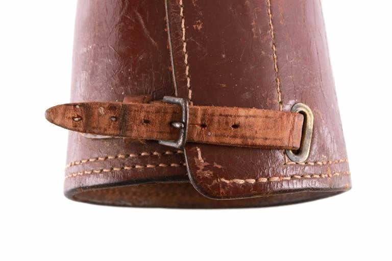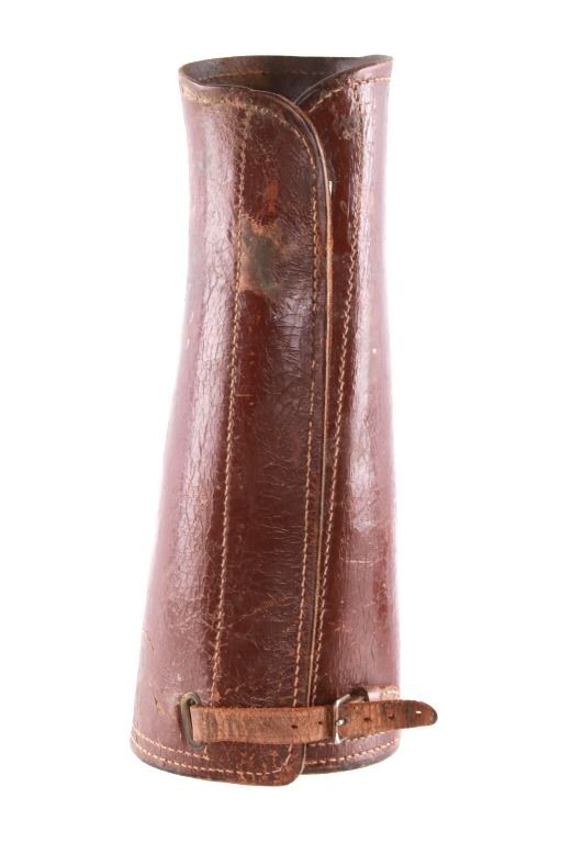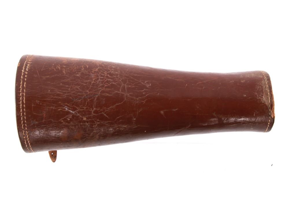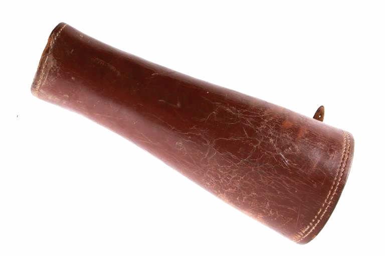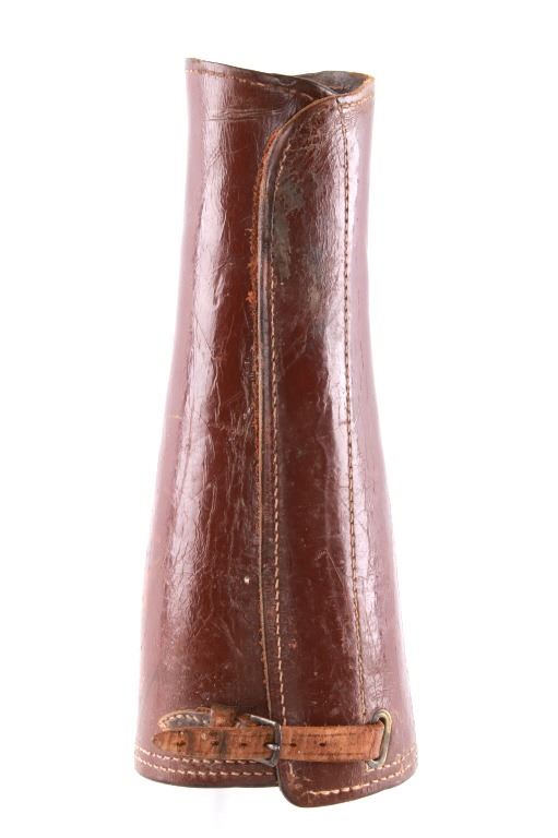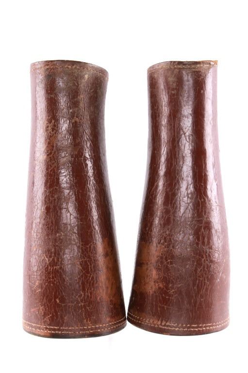 Featured in this lot is this pair of rodeo pickup man leather kickpads circa 1950's. There are two kickpads in this pair that show heavy leather construction with stainless steel slot clasp with bands of leather with buckle constructions. Kickpads are are leg bracers used to protect pickup men from getting kicked by a bucking horse. The condition of these pair of kickpads are good with some wear consistent with the age of the leather but otherwise in good overall condition. The measurements of these kickpads are 5" x 4 1/2" x 11 3/4".