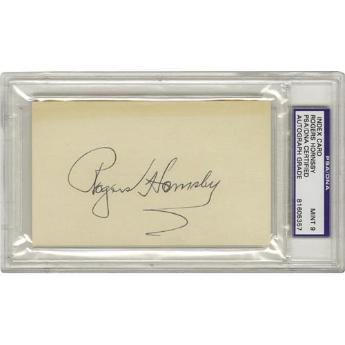 <B>1950's Rogers Hornsby Signed Index Card, PSA Mint 9.</B></I> The original Rajah suited up in his first Big League uniform in 1915, and hung up his managerial spikes at the close of the 1953 season, eleven years after his Hall of Fame induction. Despite this long professional career, quality autographs from Hornsby are not in plentiful supply. Here we present an unimprovable example, rating a perfect 10/10 on a blank 3x5" index card. Minor toning along the top edge is noted purely for accuracy's sake. Encapsulated by PSA/DNA for protection and unquestioned authenticity.