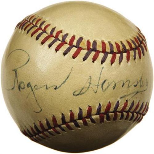 <B>1950's Rogers Hornsby Single Signed Baseball.</B></I> "Any ballplayer that don't sign autographs for little kids ain't an American," Hornsby once suggested. "He's a communist." The Hall of Fame second baseman did his part to stay in the good graces of Senator Joe McCarthy with this offering, a massive and flawlessly rendered blue ink sweet spot signature upon an "Official Sandlot League" sphere. The autograph rates an 8.5/10, with the red and blue stitching and gorgeously toned horsehide very effectively recalling the official balls of the prewar Big Leagues. Certainly one of the finest Hornsby singles to come down the pike in quite some time. <I>LOA from James Spence Authentication.</B></I><BR><BR><b>Shipping:</b> Balls, Pucks, etc., Small (<a target="_blank" href="http://www.heritageauctions.com/common/shipping.php">view shipping information</a>)