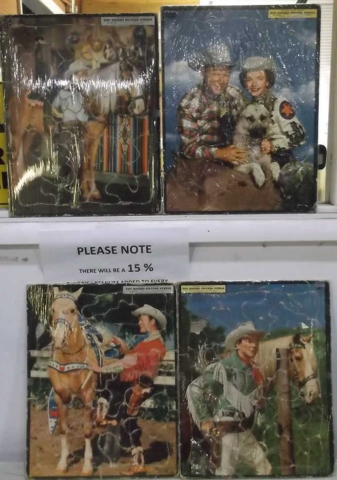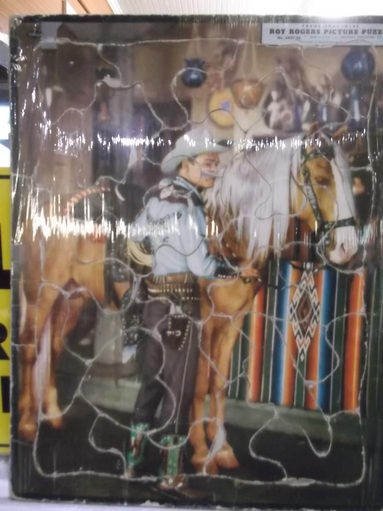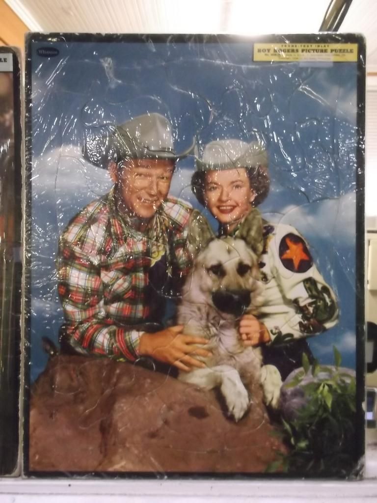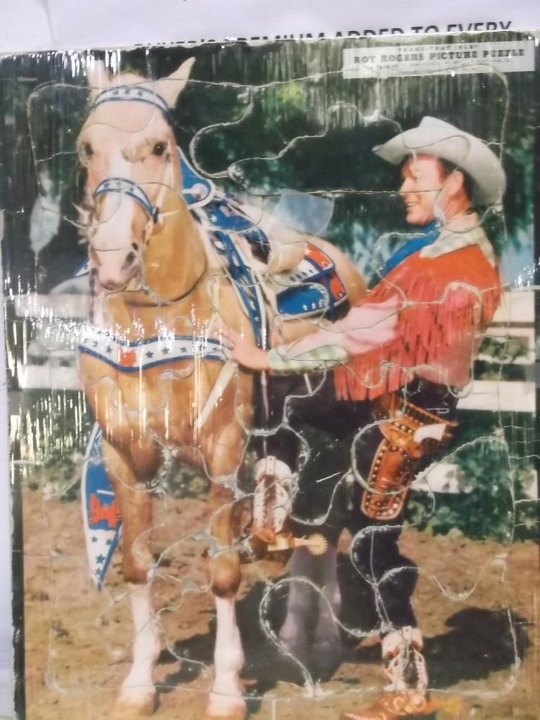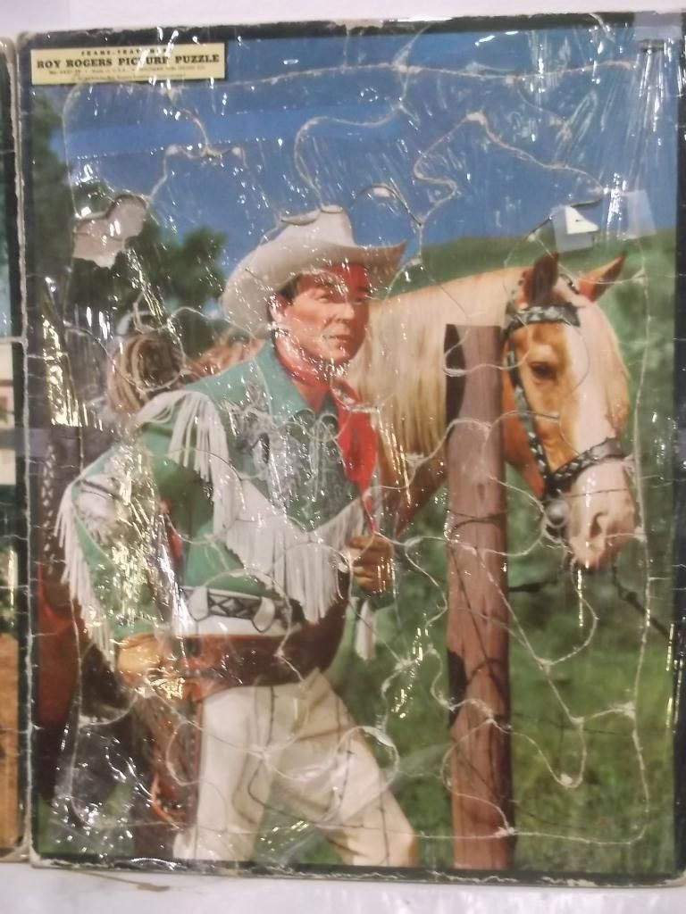 Four Roy Rogers, Dale Evans and Trigger Puzzles they are wrapped in plastic that is why the pictures look a little funny all but one in real good condition the one with Roy with green shirt has a small tare but over all very nice