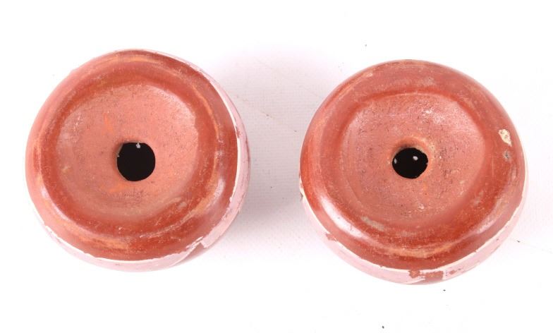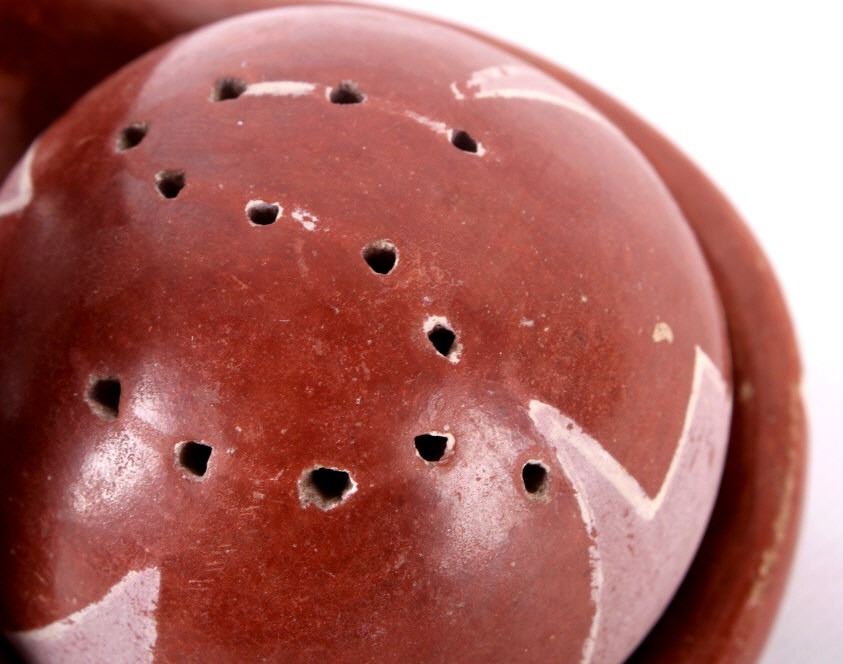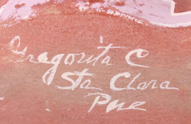 Featured in this lot are Santa Clara Pottery Salt and Pepper Shakers and Holder, circa 1950's. The Santa Clara Pueblo is home to some of the most famous pottery artists in the world. This piece includes the salt and pepper shakers, each labeled, as well as the holder. They are painted red with a geometric pattern design. The bottom of the holder is marked with a museum collector number, as well as "Gregorita C Sta Clara Pue". The set is in good condition (some cracks and chips showing) and measures 6" long x 3.5" tall x 3" wide.