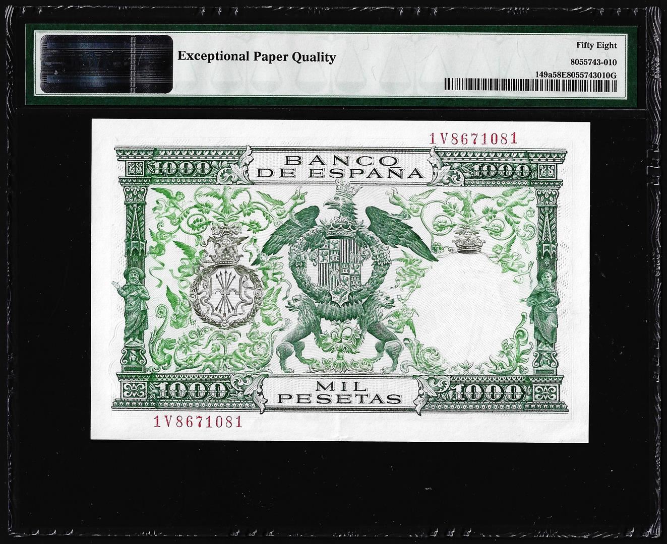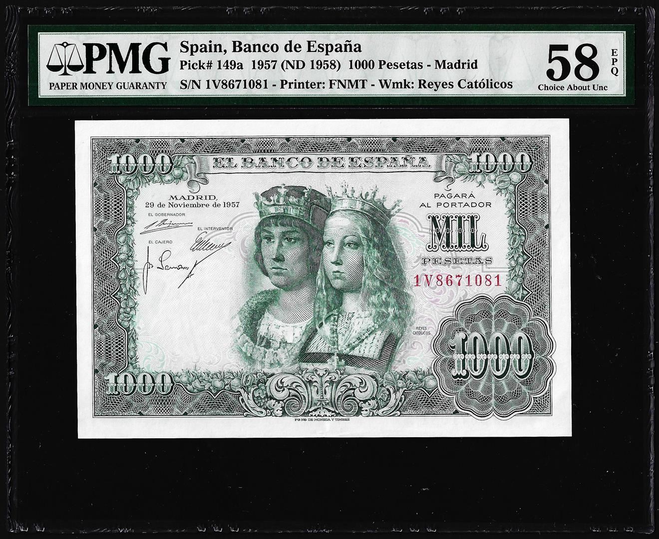 One 1950's Spain Banco de Espana 1,000 Pesetas Note Pick# 149a PMG Choice About UNC 58EPQ. PMG Certified.