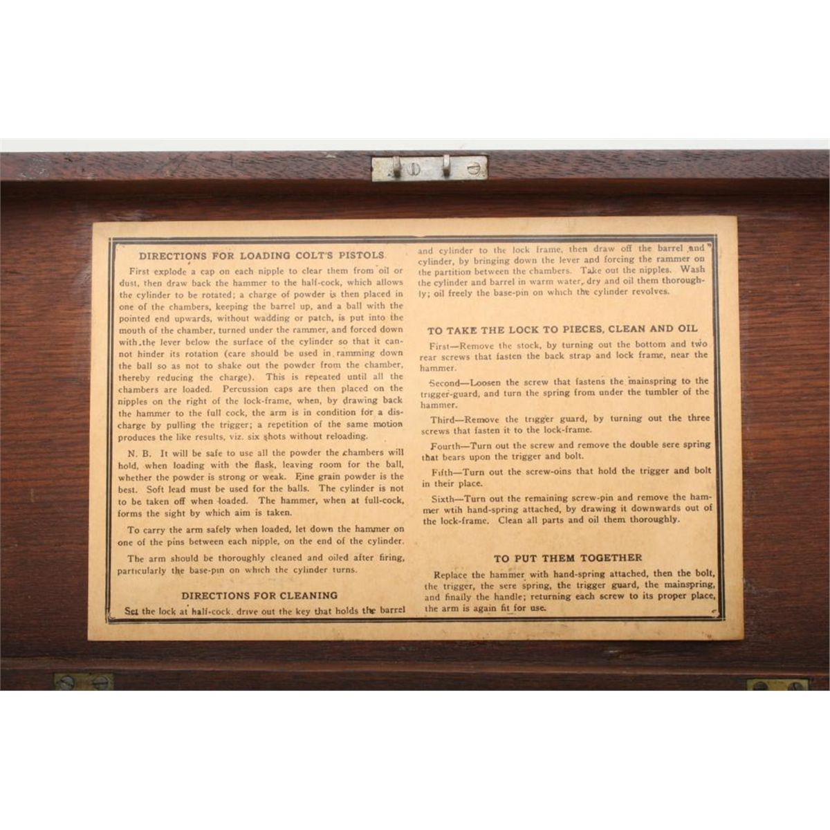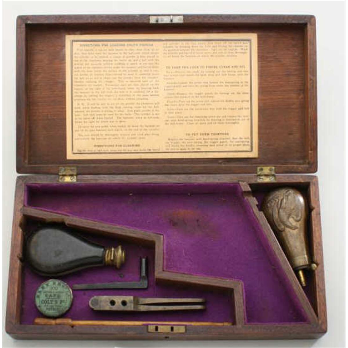 1950’s era wooden case for two colt 1849 pocket models with 4” barrels. The case shows thick wood partitions with purple velveteen lining. The configuration of the casing is odd and not in Colt design, just collectormade for display. The case contains a very good pocket model flask showing eagle and pistol showing 50% lacquer, an early brass mold in good condition, original nipple wrench in good condition, an Eley cap tinwith good label that has been opened, and a leather ball flask with embossed gold edge that is probably French and of the type found with high grade European pistols of the 1800-1860 era in good condition. The lid ofthe case show a facsimile label. The case is well made with brass fittings and is of a recognizable 1950’s type with two very nice accessories. Est: $400 - $800