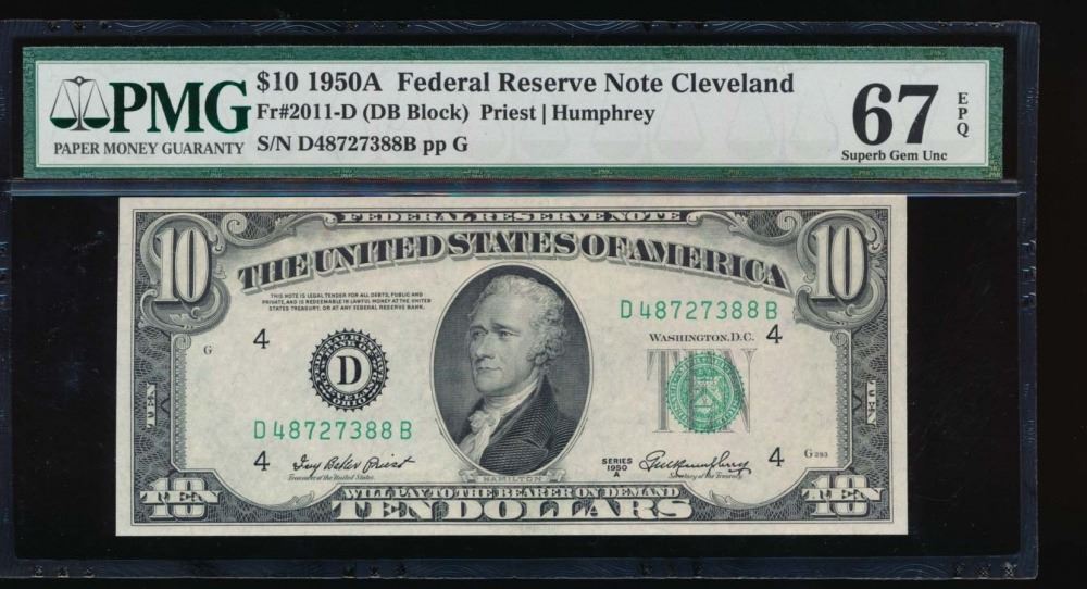 One 1950A $10 Cleveland Federal Reserve Note PMG 67EPQ.