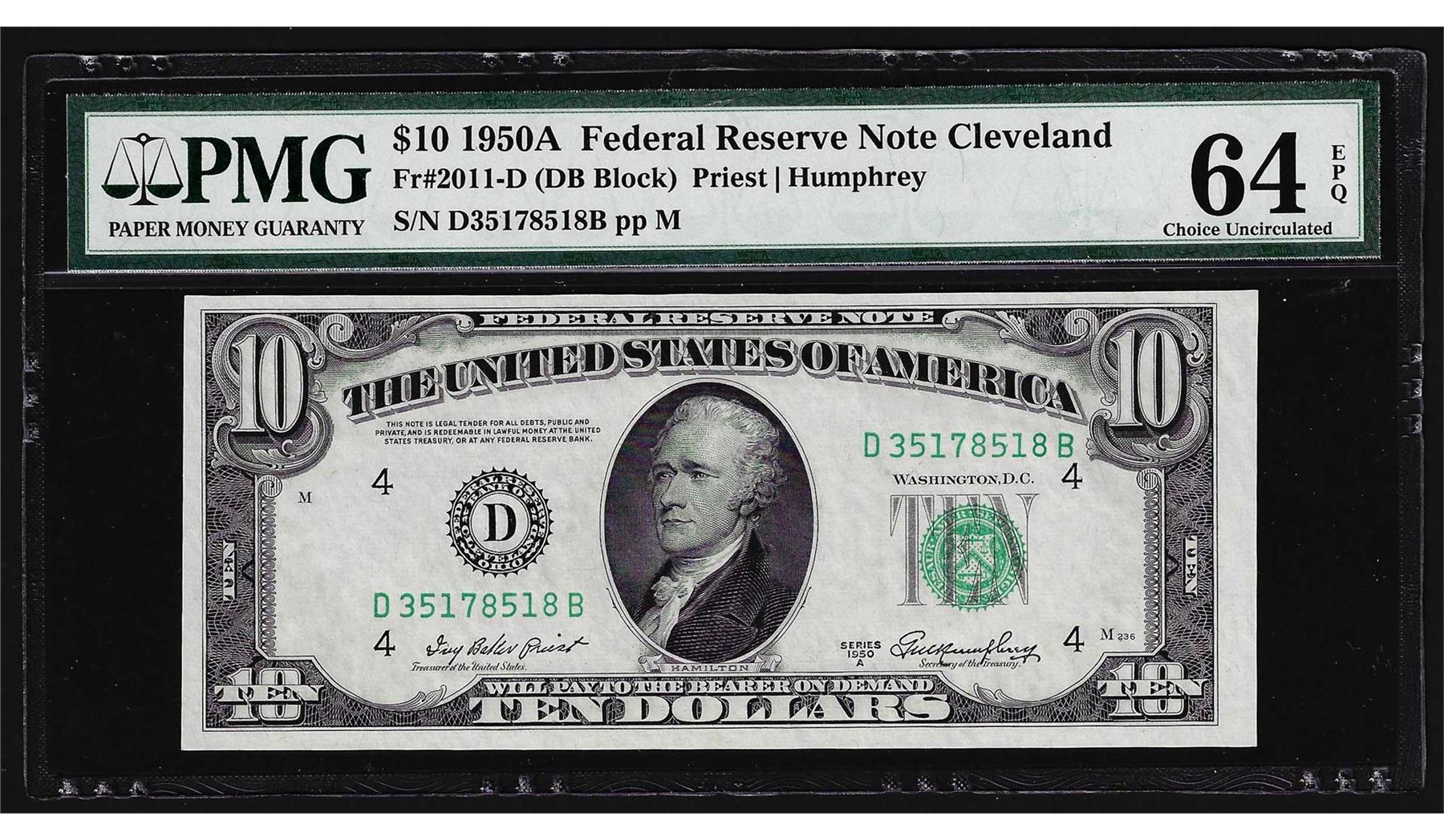 One 1950A $10 Federal Reserve Note Cleveland Fr. 2011-D PMG Choice Uncirculated 64EPQ. PMG Appraised.