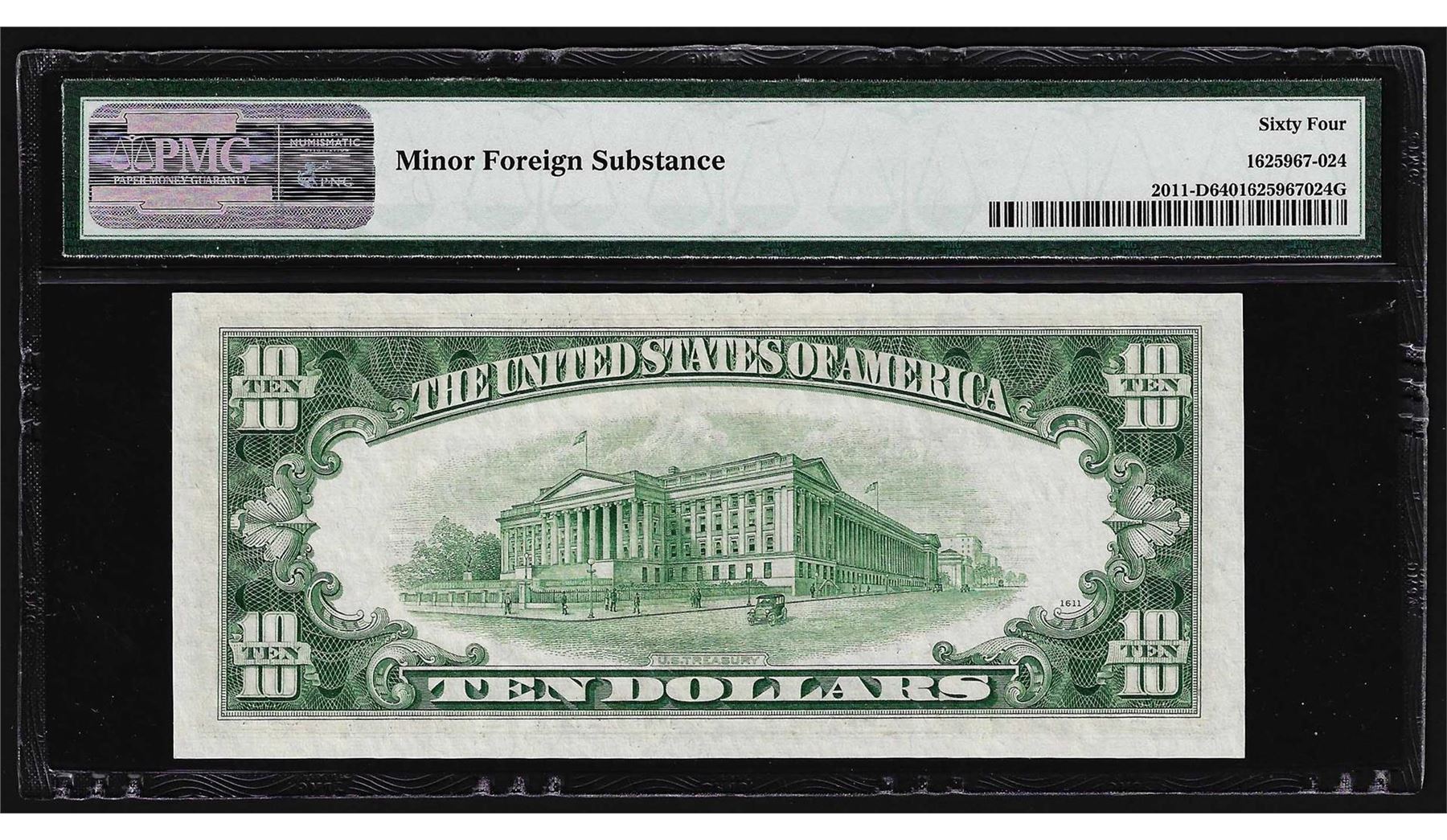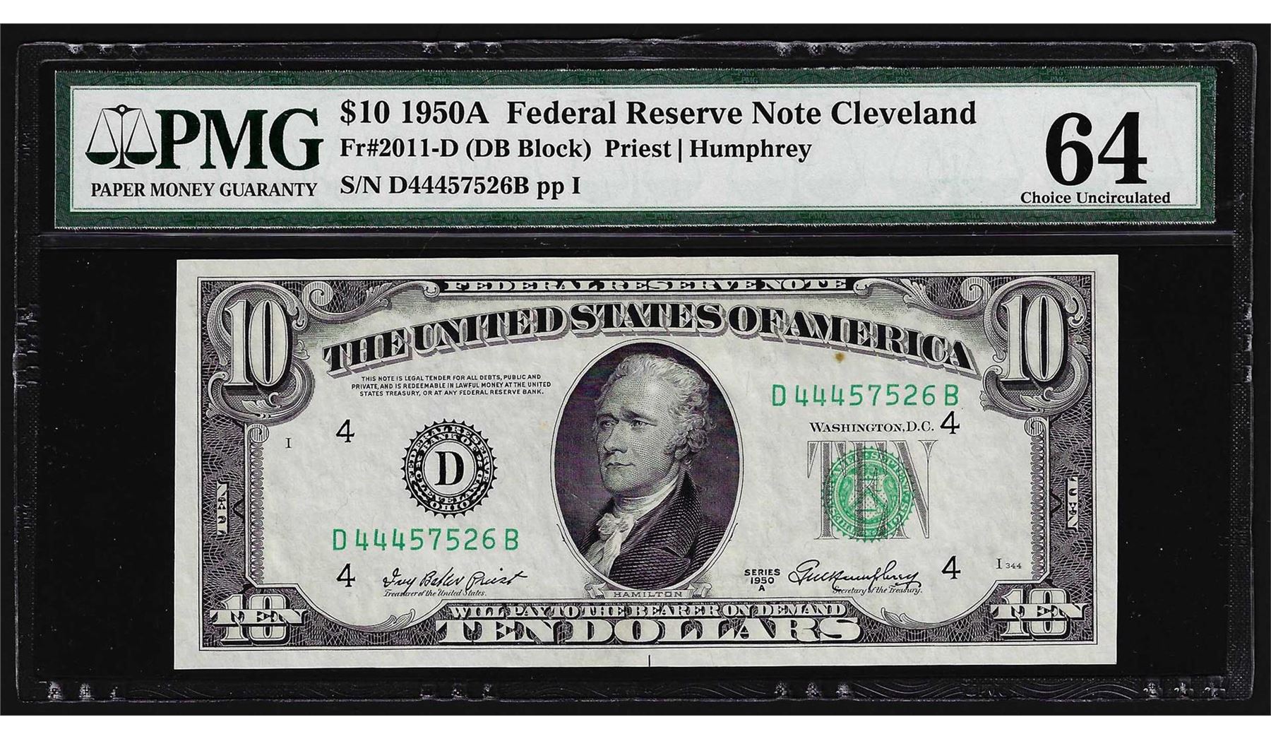 One 1950A $10 Federal Reserve Note Cleveland Fr. 2011-D PMG Choice Uncirculated 64. PMG Certified.
