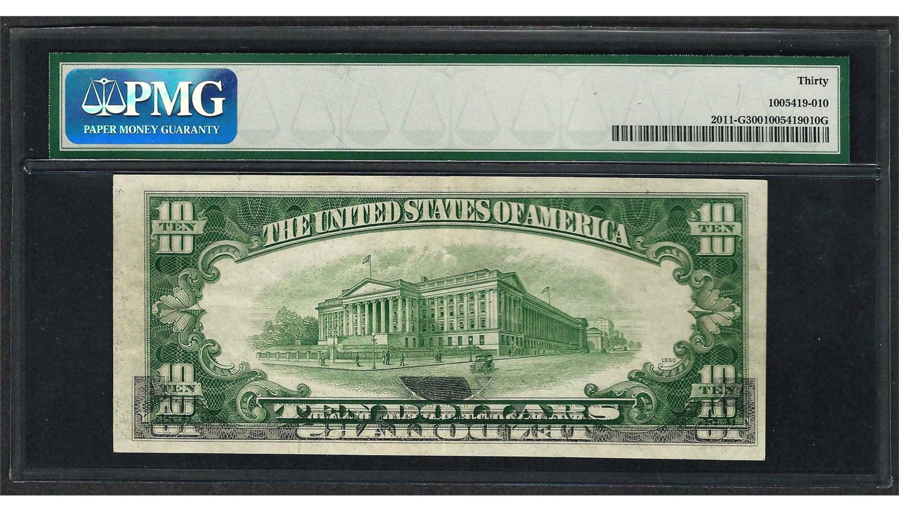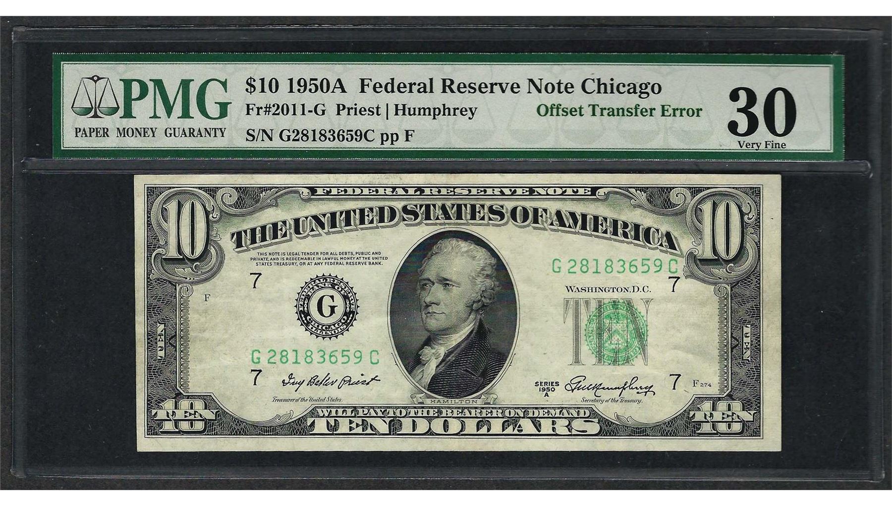 One 1950A $10 Federal Reserve Note ERROR Offset Transfer PMG Very Fine 30. PMG Certified.