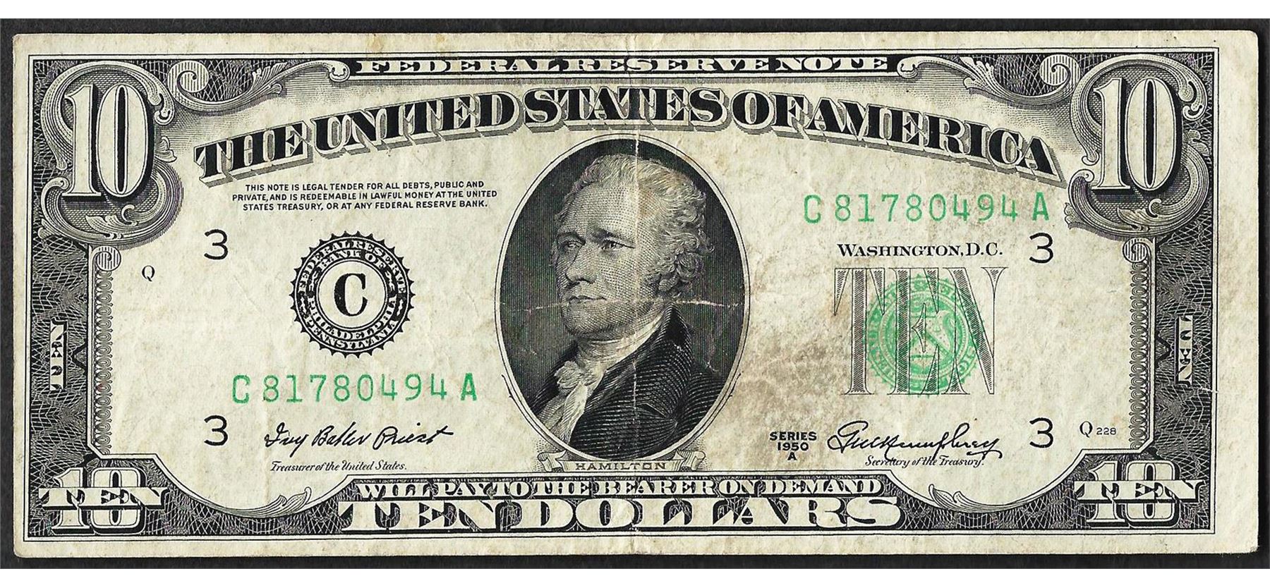 One 1950A $10 Federal Reserve Note Misalignment ERROR.