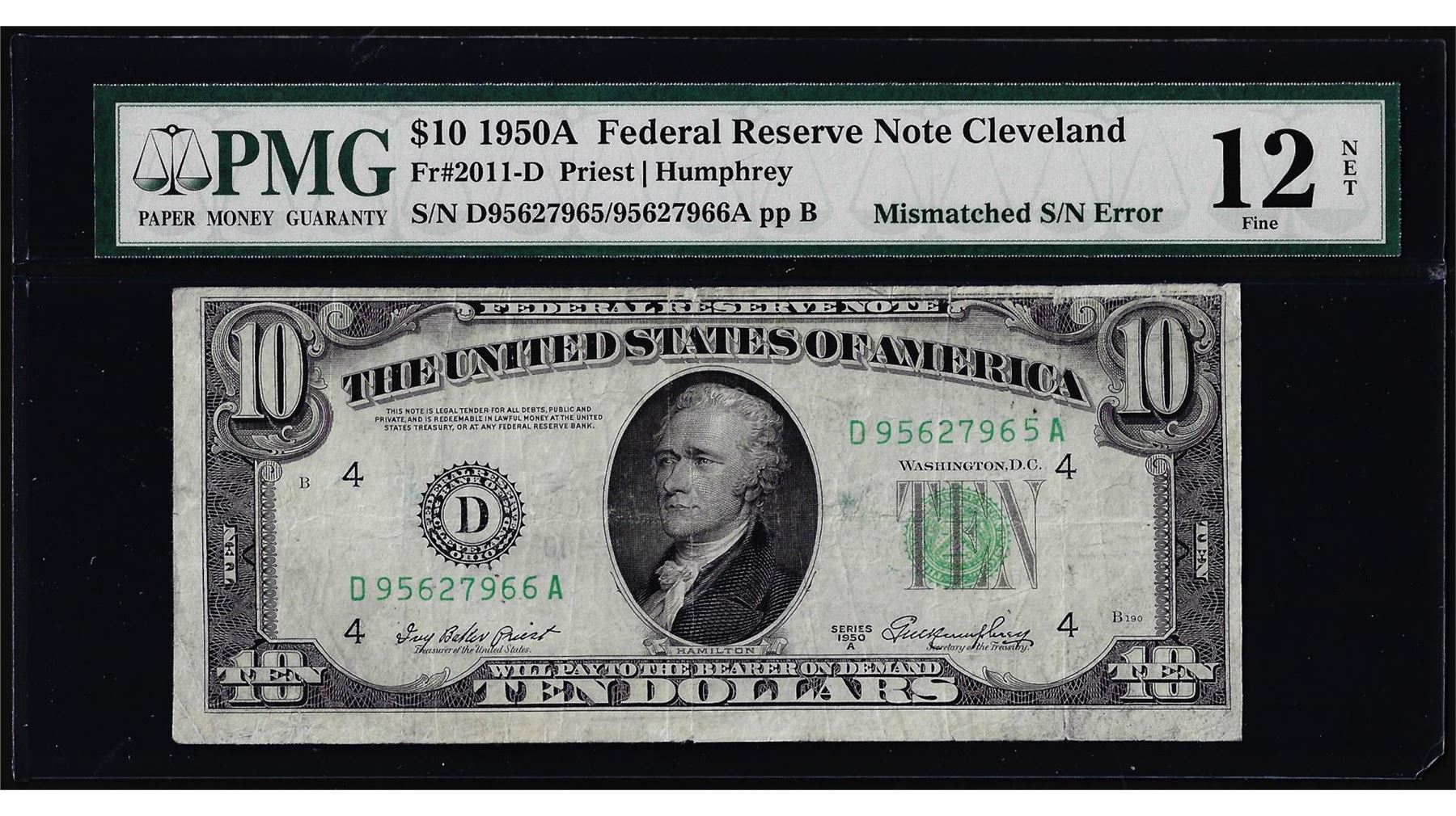 One 1950A $10 Federal Reserve Note Mismatched Serial Number Error Fr.2011-D PMG Fine 12 Net. PMG Certified.