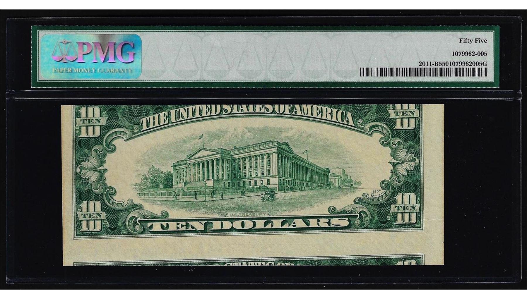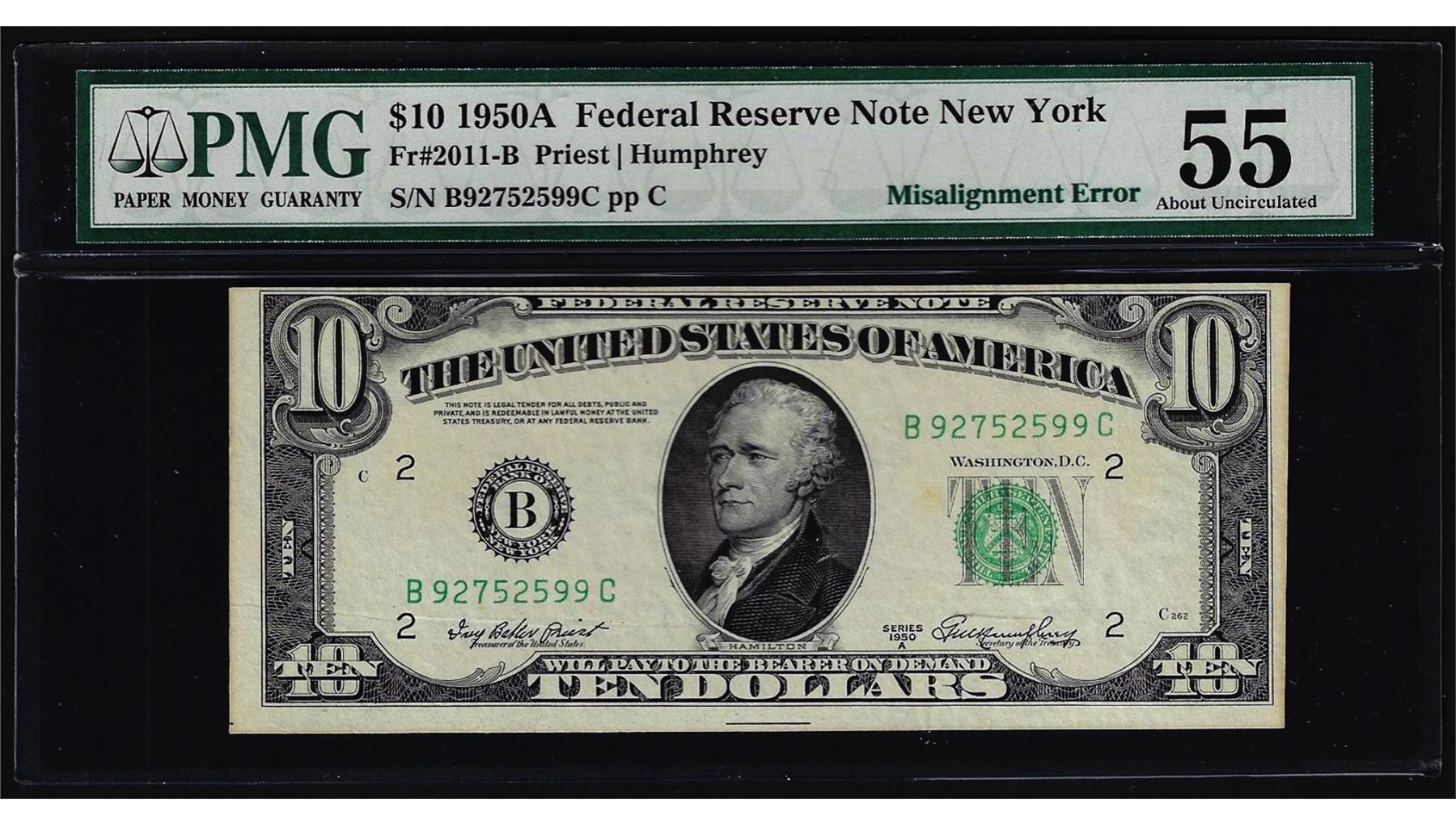 One 1950A $10 Federal Reserve Note New York Misalignment Error PMG About Uncirculated 55. PMG Certified.