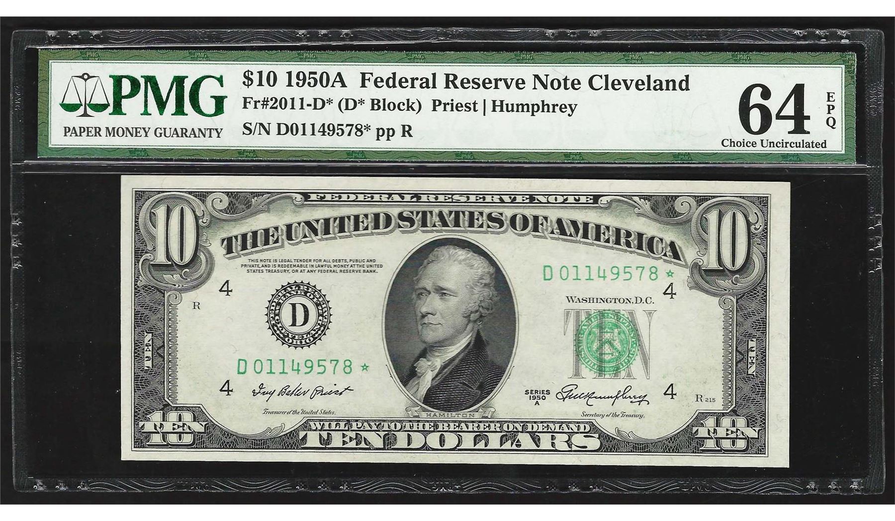 One 1950A $10 Federal Reserve STAR Note Cleveland PMG Choice Uncirculated 64EPQ. PMG Certified.