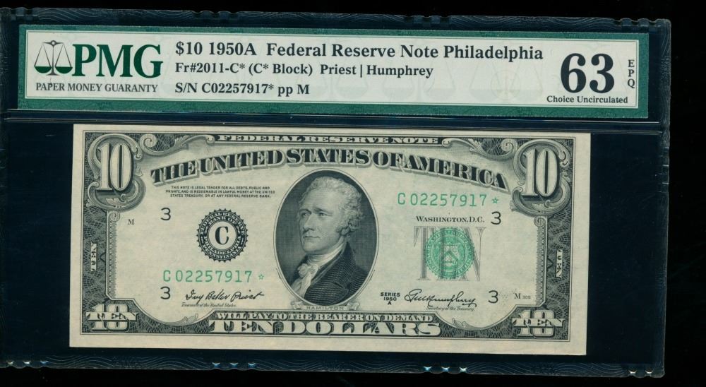 One 1950A $10 STAR Philadelphia FRN PMG 63EPQ.