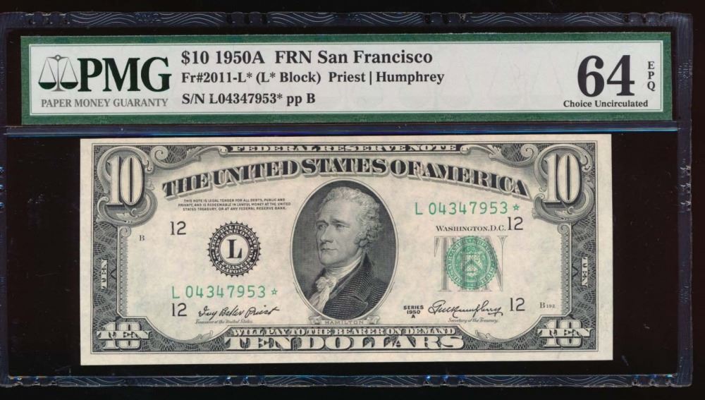 One 1950A $10 San Francisco Federal Reserve Star Note PMG 64EPQ.