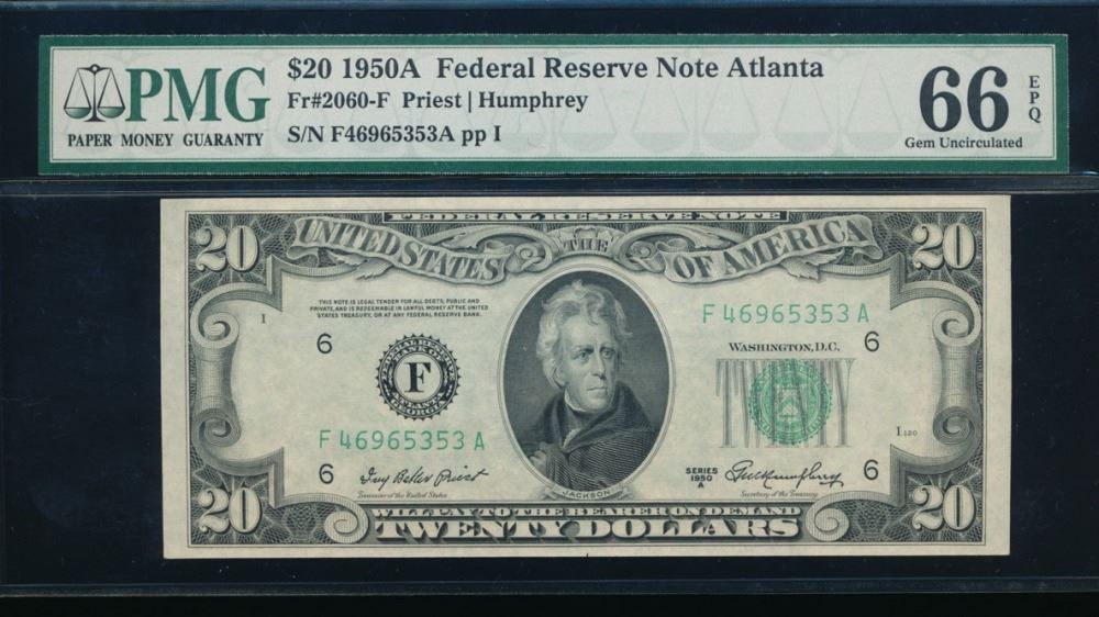 One 1950A $20 Atlanta Federal Reserve Note PMG 66EPQ.
