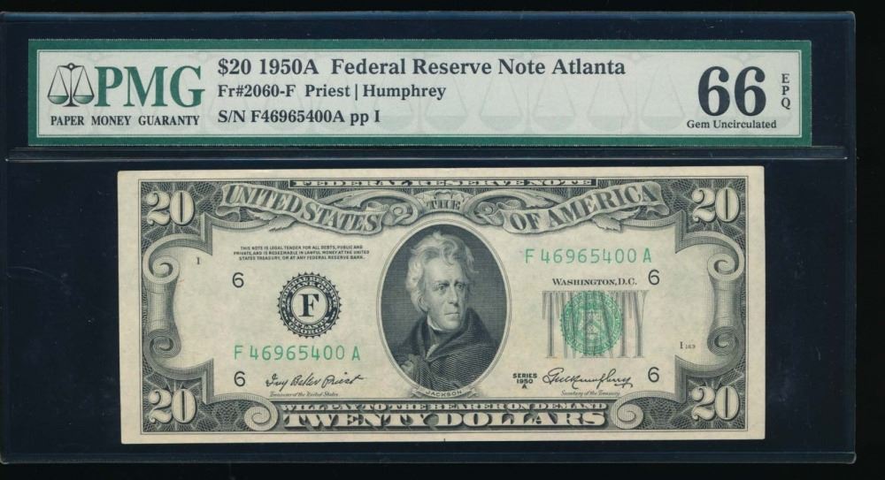 One 1950A $20 Atlanta Federal Reserve Note PMG 66EPQ.