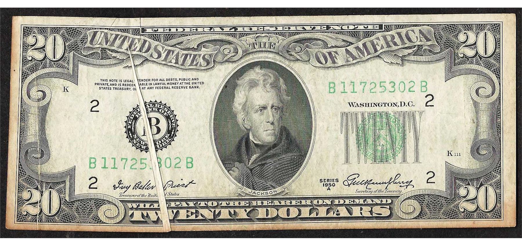 One 1950A $20 Federal Reserve Note Gutter Fold ERROR.