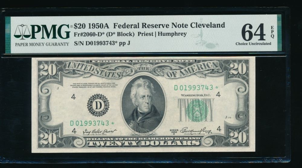 One 1950A $20 STAR Cleveland FRN PMG 64EPQ.