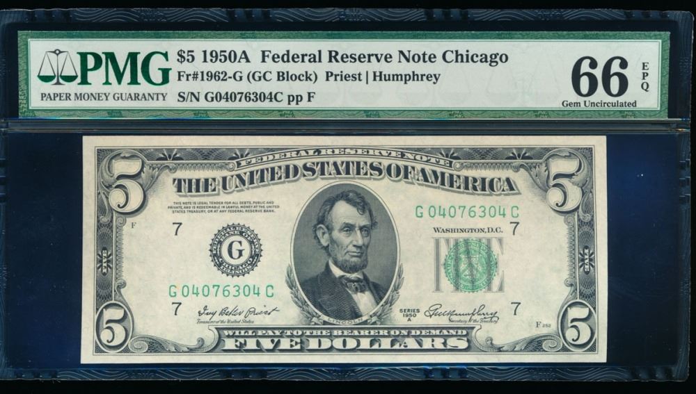 One 1950A $5 Chicago Federal Reserve Note PMG 66EPQ.