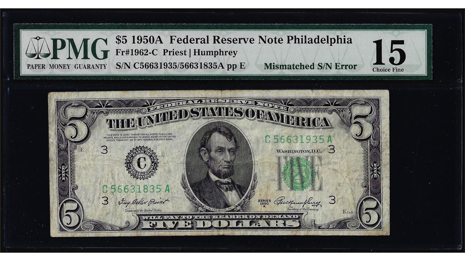 One 1950A $5 Federal Reserve Note Mismatched Serial Number Error Fr.1962-C PMG Ch. Fine 15. PMG Certified.