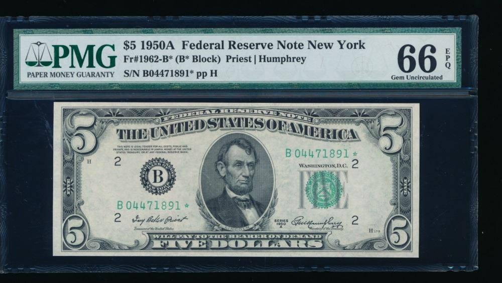 One 1950A $5 New York Federal Reserve Note PMG 66EPQ.