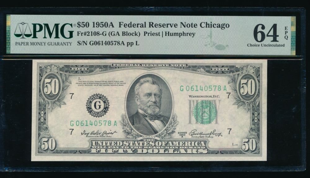 One 1950A $50 Chicago FRN PMG 64EPQ.