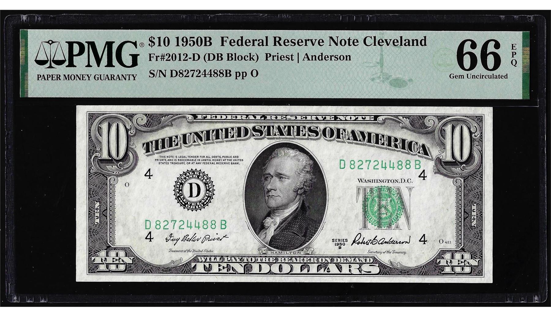 1950B $10 Federal Reserve Note Cleveland Fr.2012-D PMG Gem Uncirculated 66EPQ