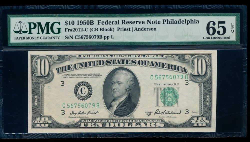 One 1950B $10 Philadelphia FRN PMG 65EPQ.