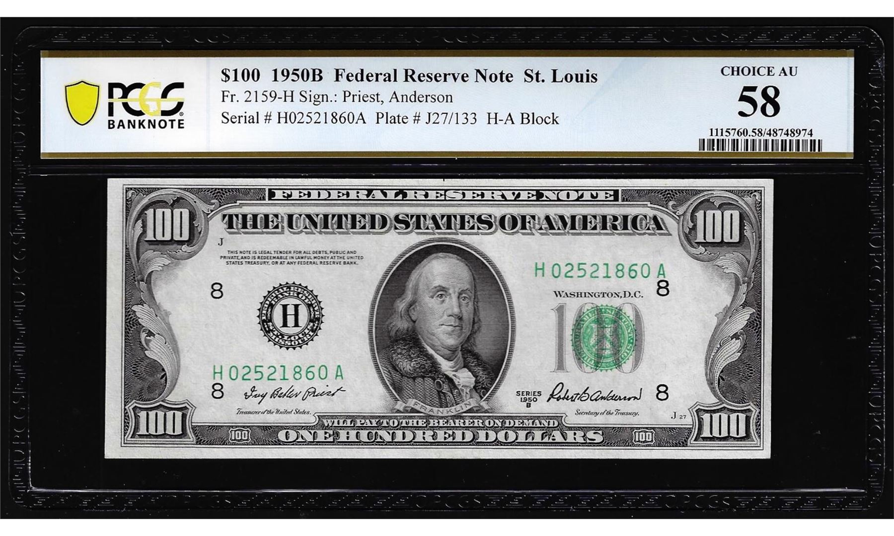 One 1950B $100 Federal Reserve Note St. Louis Fr.2159-H PCGS Choice AU 58. PCGS Graded.