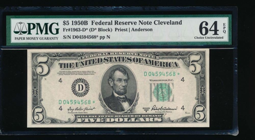One 1950B $5 Cleveland Federal Reserve Star Note PMG 64EPQ.