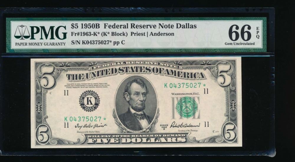 One 1950B $5 Dallas Federal Reserve Star Note PMG 66EPQ.