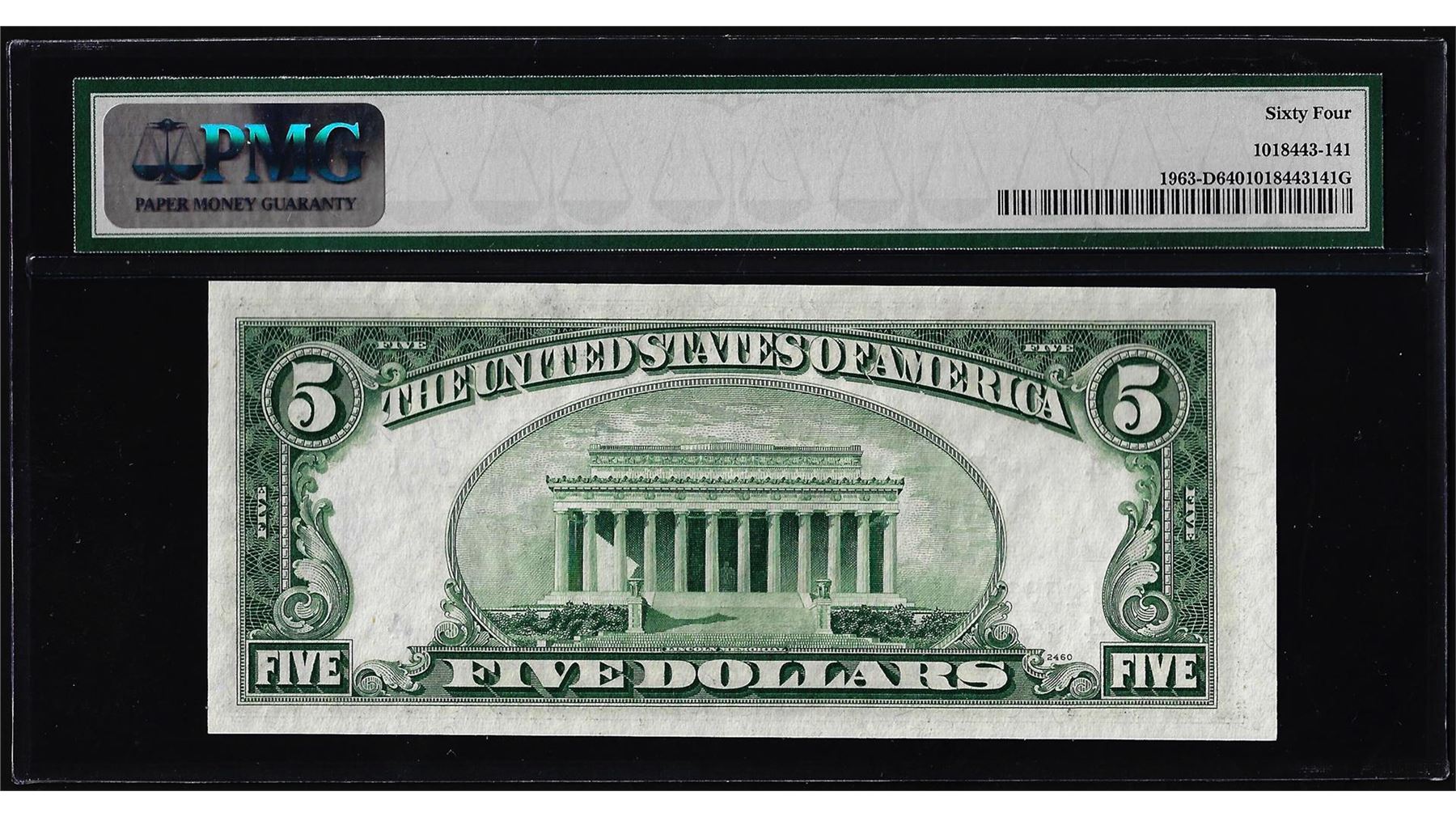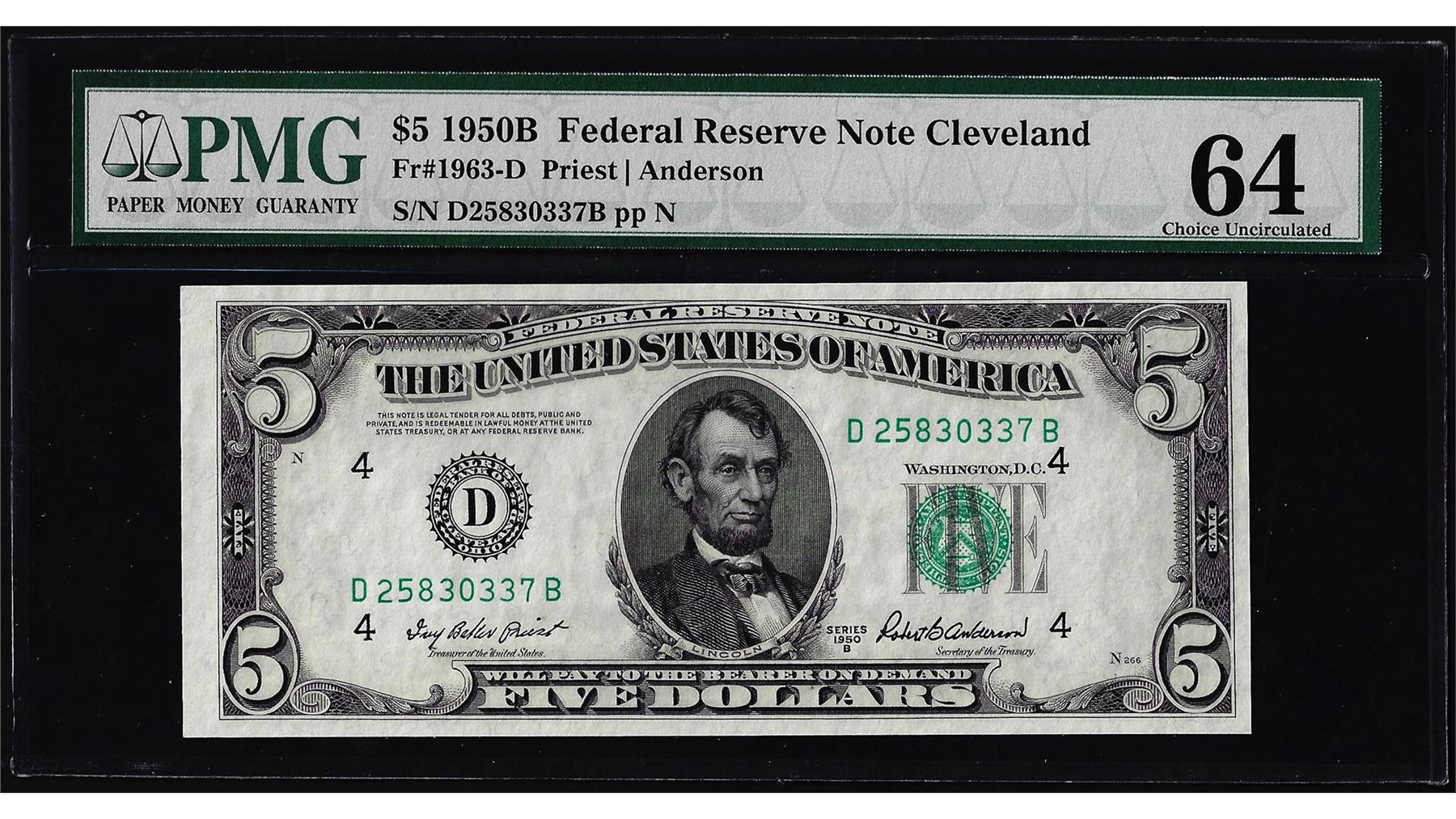 One 1950B $5 Federal Reserve Note Cleveland Fr.1963-D PMG Choice Uncirculated 64. PMG Certified.