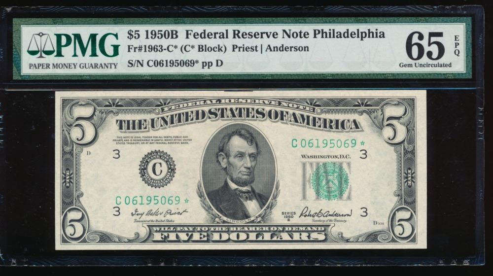 One 1950B $5 STAR Philadelphia FRN PMG 65EPQ.