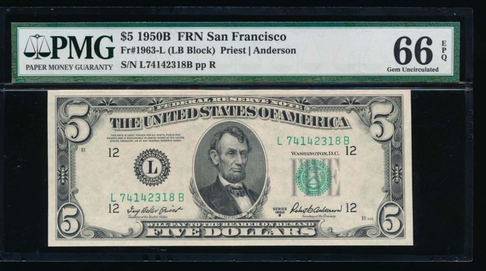 One 1950B $5 San Francisco Federal Reserve Note PMG 66EPQ.