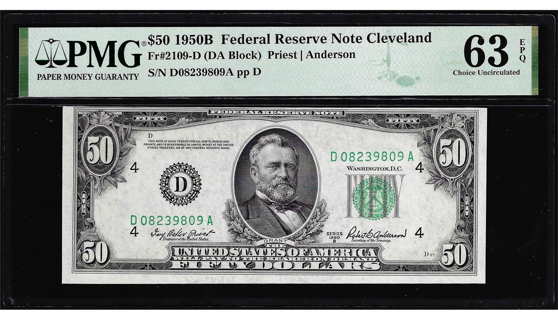One 1950B $50 Federal Reserve Note Cleveland Fr.2109-D PMG Choice Uncirculated 63EPQ. PMG Certified.